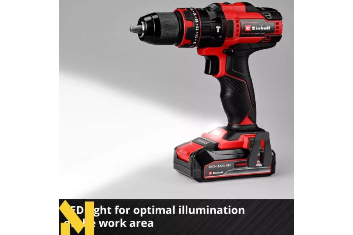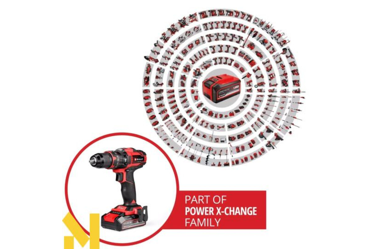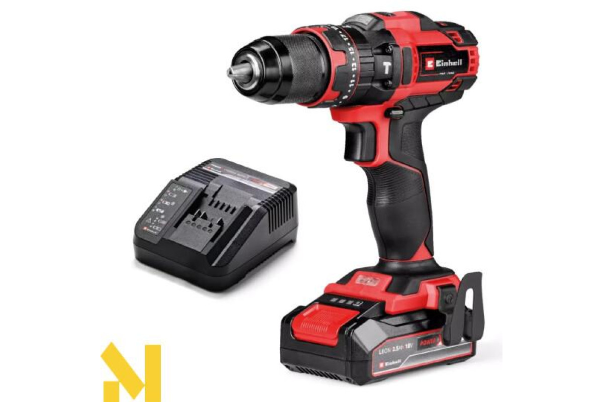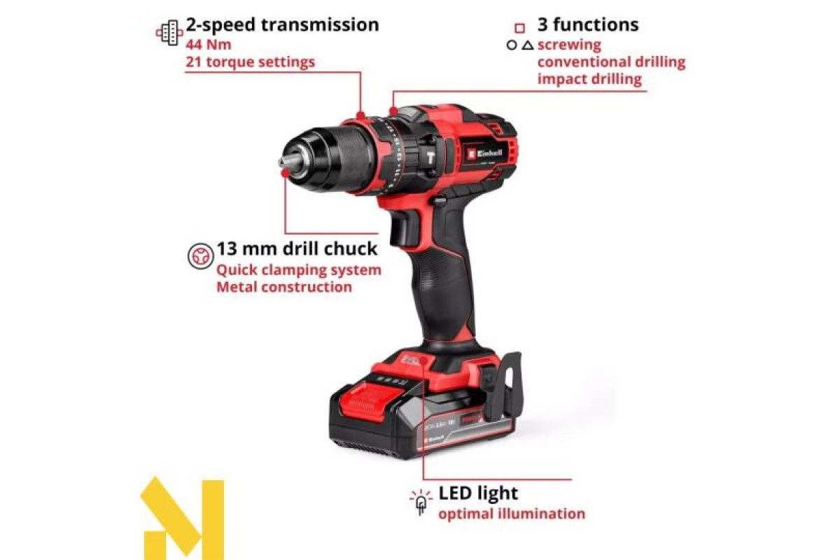 Einhell TE-CD 18/44 Li-i (1x2,5 Ah) — це універсальний та потужний ударний дриль-шурупокрут, який ідеально підходить як для домашніх майстрів, так і для професійного використання. Інструмент входить до сімейства Power X-Change та сумісний з усіма акумуляторами та зарядними пристроями цієї серії. Завдяки двошвидкісній редукторній коробці, він забезпечує потужний крутний момент до 44 Нм, що дозволяє ефективно працювати з широким спектром матеріалів.