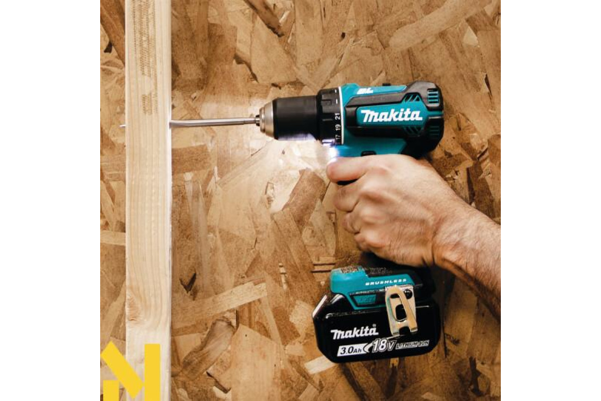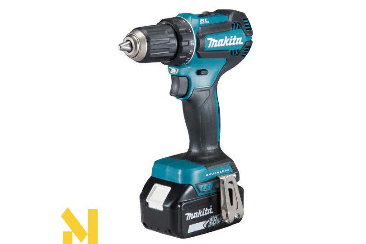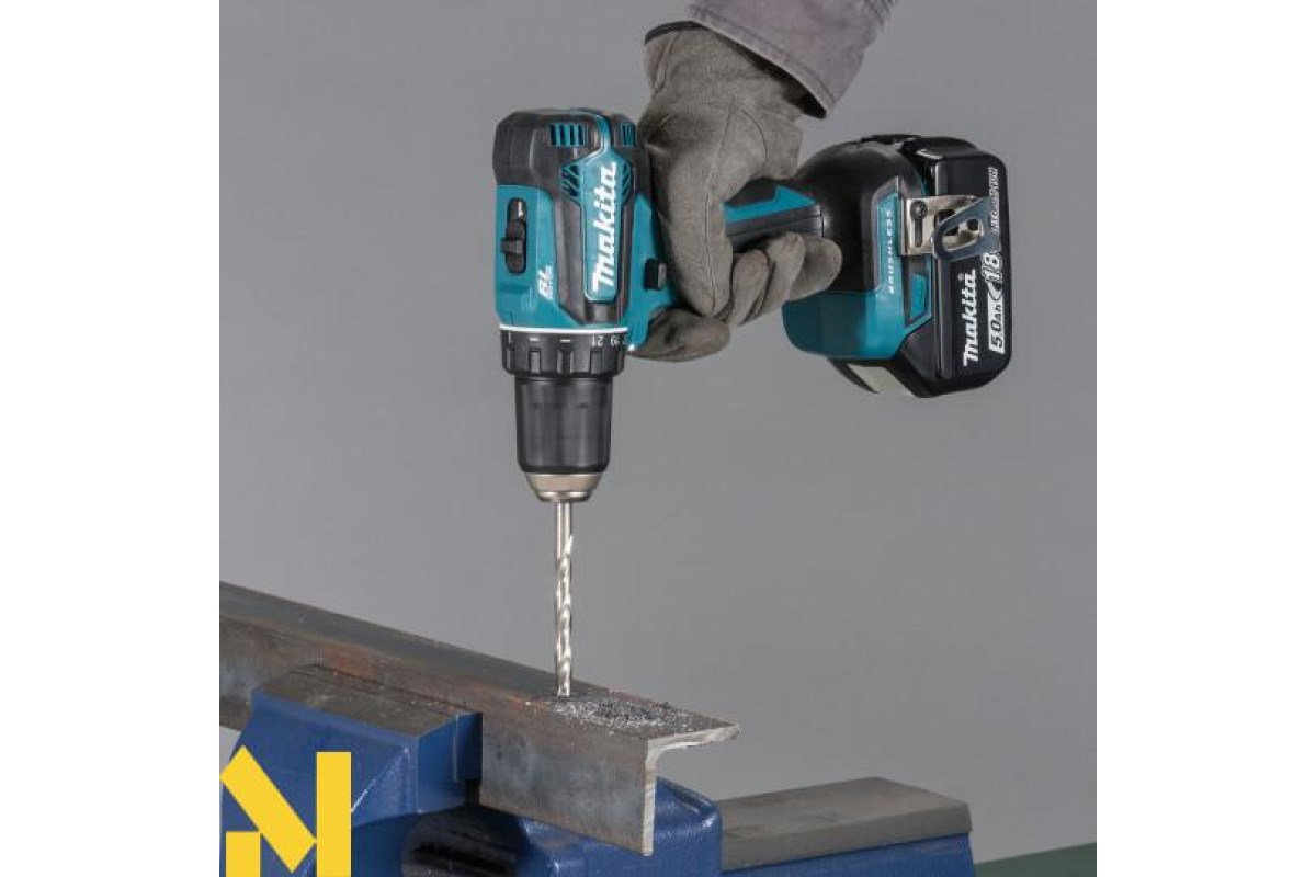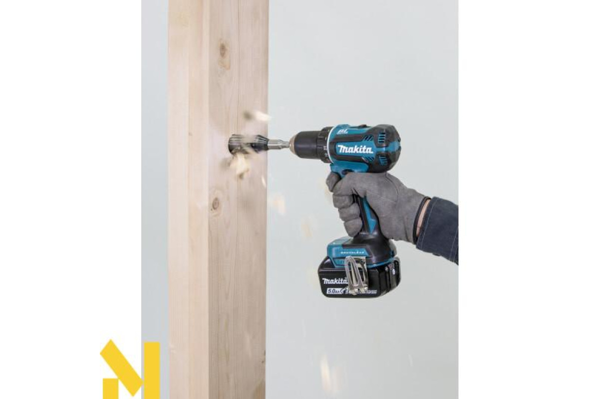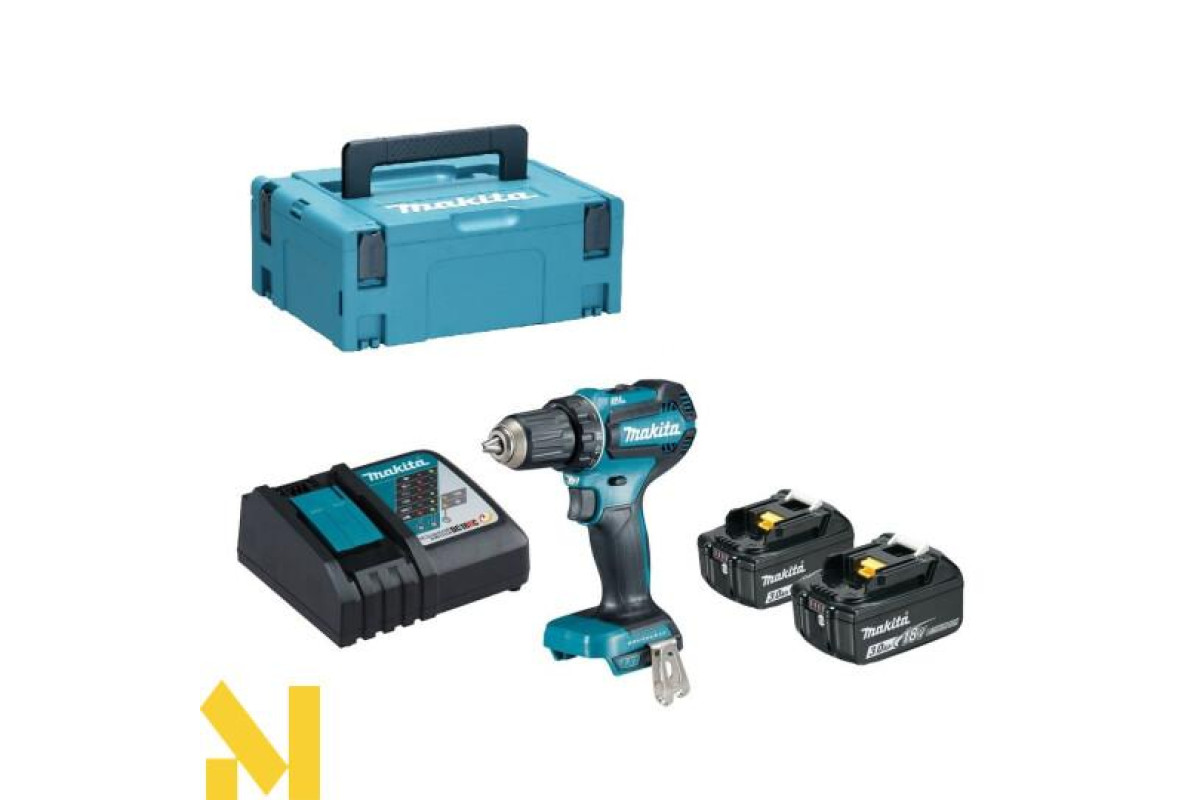 Акумуляторний дриль-шуруповерт MAKITA DDF485RTJ з максимальним моментом затягування 50 Нм. У цьому комплекті з двома акумуляторами 18В ємністю 5.0Ач, зарядним пристроєм та системним кейсом MAKPAC.