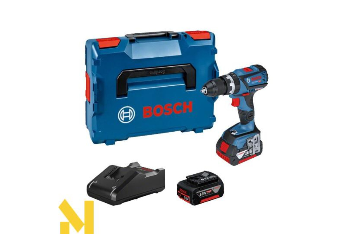 Для повноцінної роботи з Bosch GSB 18V-60 C у наборі є усе необхідне: 2 акумуляторні батареї, аби замінювати одна на одну, зарядка та, для транспортування і компактного зберігання, пластиковий кейс.