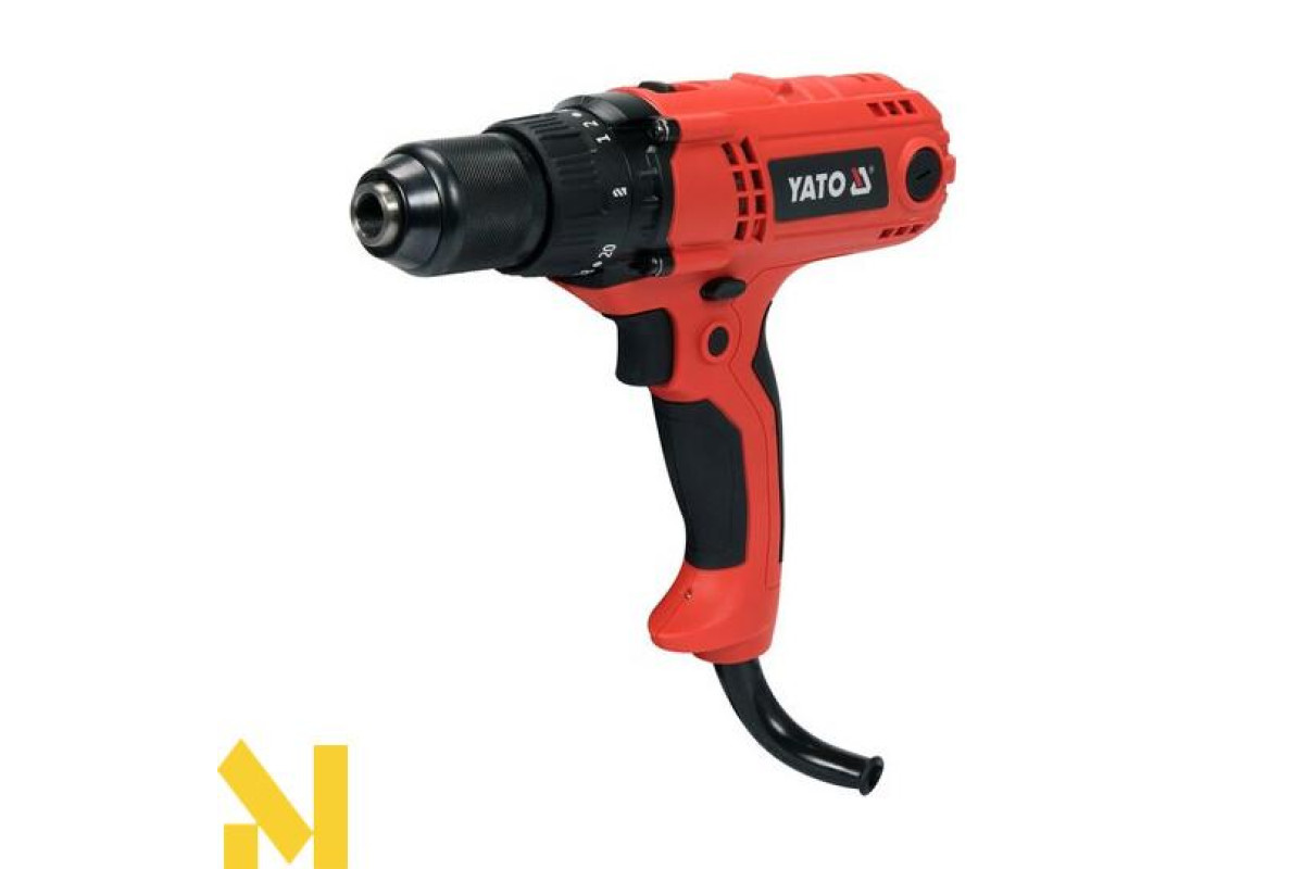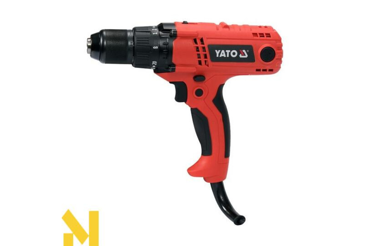 Мережева дриль YT-82063 для обробки дерева і металу зі свердлами і шурупами великого діаметру. Найпотужніша дриль-шуруповерт у класі пристроїв (85 НМ) з живленням від мережі 240 В.