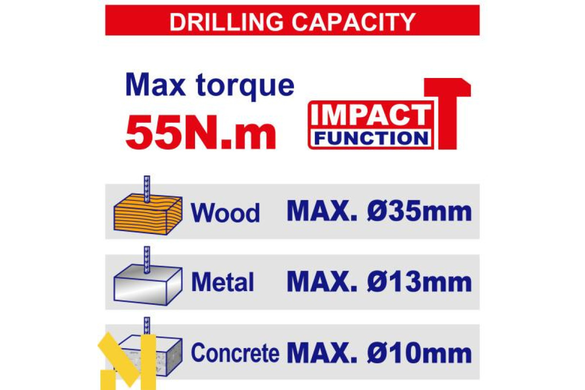 Універсальність: Підходить для свердління отворів, закручування шурупів і виконання ударних робіт у різних матеріалах.