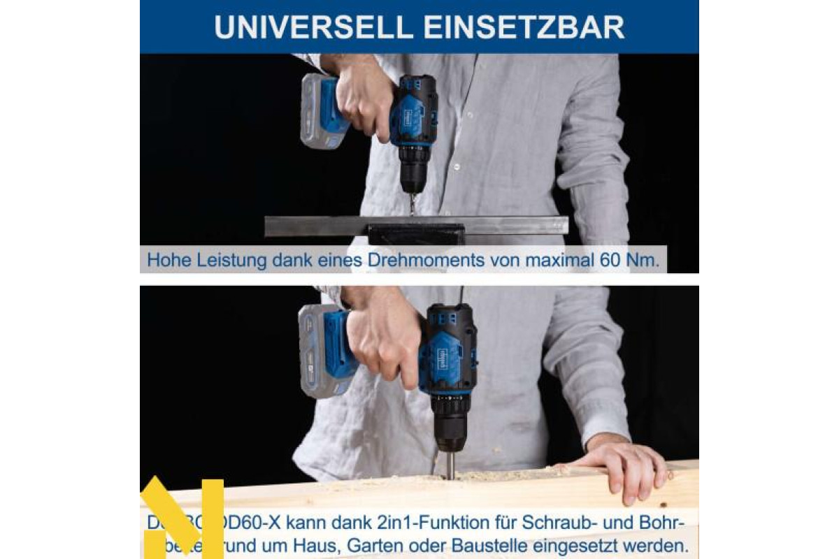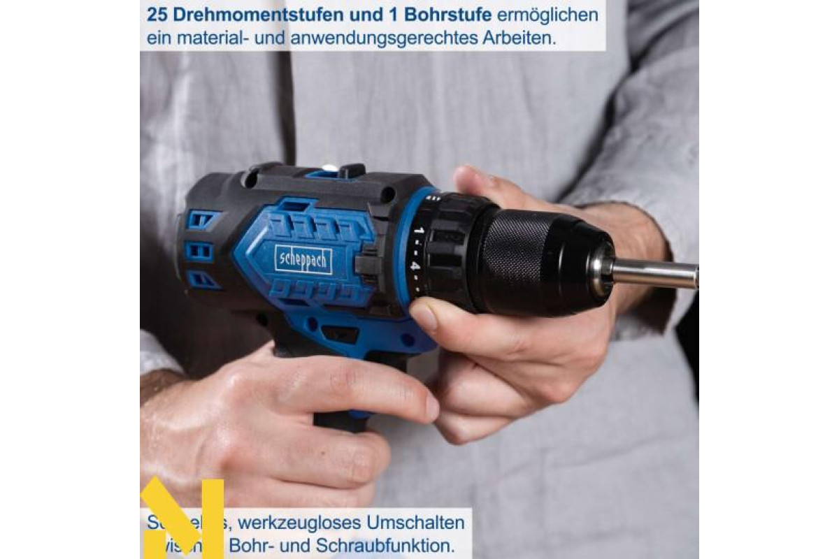 З максимальним крутним моментом 60 Нм, акумуляторний дриль-шурупокрут Scheppach BC-DD60-X є практичним універсальним інструментом для використання вдома, в саду, на будівельних майданчиках або в дорозі. Оснащений потужним 2-швидкісним редуктором та міцним металевим швидкозатискним патроном з діапазоном затискання 1,5–13 мм, BC-DD60-X ідеально підходить для потужного загвинчування. BC-DD60-X оснащений потужним безщітковим двигуном. Цей безщітковий двигун забезпечує особливо високу ефективність, довший час роботи, тривалий термін служби та знижений знос. Як частина серії Scheppach IXES 20 вольт, усі акумулятори та зарядні пристрої системи можна комбінувати з дрилем-шурупокрутом. Акумулятори та зарядні пристрої доступні окремо.