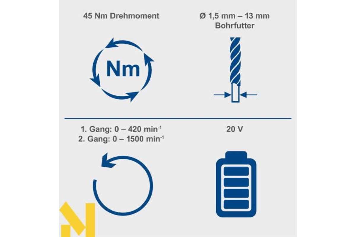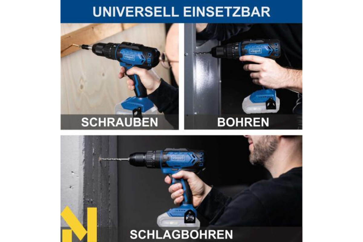 Акумуляторний ударний дриль Scheppach C-CD45-X із практичною функціональністю 3-в-1 ідеально підходить для свердління, ударного свердління та загвинчування шурупів. З максимальним крутним моментом 45 Нм, потужною 2-швидкісною коробкою передач та 19 налаштуваннями крутного моменту, режимом свердління та режимом ударного свердління, це потужний універсальний інструмент для використання вдома, в саду, на будівельних майданчиках або для мобільних робіт. Як частина серії Scheppach IXES 20 вольт, усі акумулятори та зарядні пристрої системи можна комбінувати з ударним дрилем.