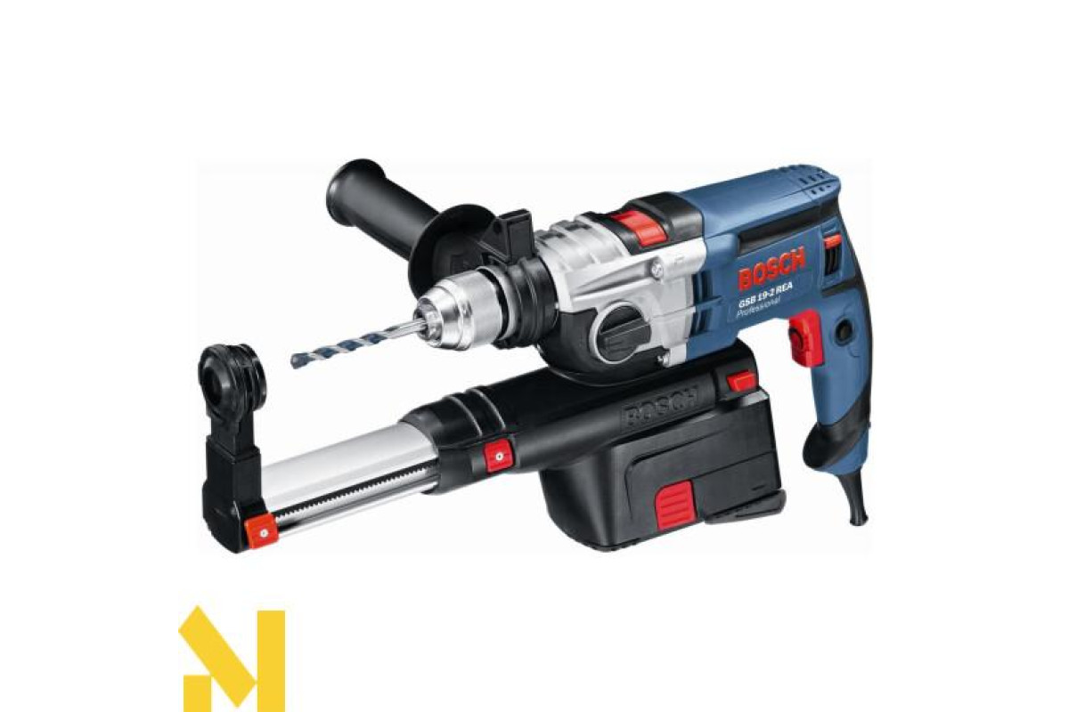 Ударний дриль Bosch GSB 19-2 REA оснащена потужним електричним двигуном, редуктором в металевому корпусі для довговічної роботи і шарнірним кріпленням силового кабелю для забезпечення максимальної рухливості і запобігання розривів, а також обладнані системою всмоктування пилу в пилозбірник.