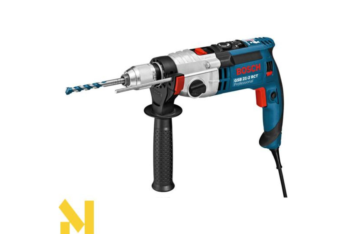 Двошвидкісний ударний дриль Bosch GSB 21-2 RCT з потужним двигуном (1300 Вт) і високим крутним моментом (43 / 20,5 Нм) для виконання найскладніших робіт з виготовлення отворів великих діаметрів, а також для загвинчування. Кількість оборотів на 1-ій передачі 0-900 об / хв, на 2-й - 0-3000 об / хв. Число ударів 0-15300 уд / хв і 0-51000 уд / хв. Отвори в бетоні максимальним діаметром 22/13 мм, цегляній кладці - 24/16 мм, деревині - 40/25 мм, стали - 16/10 мм. Шийка шпинделя 43 мм. Інструмент поставляється в кейсі з обмежувачем глибини (210 мм), швидкозажимним патороном 13 мм, додатковою рукояткою.