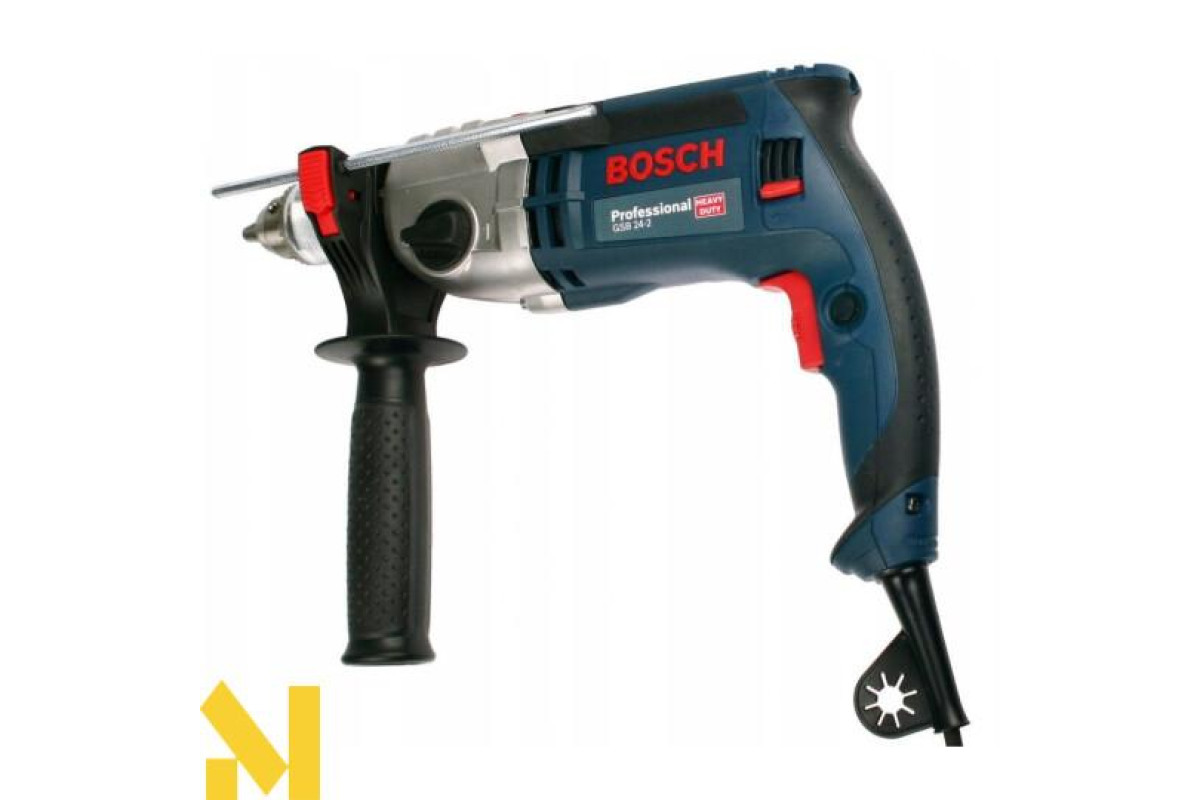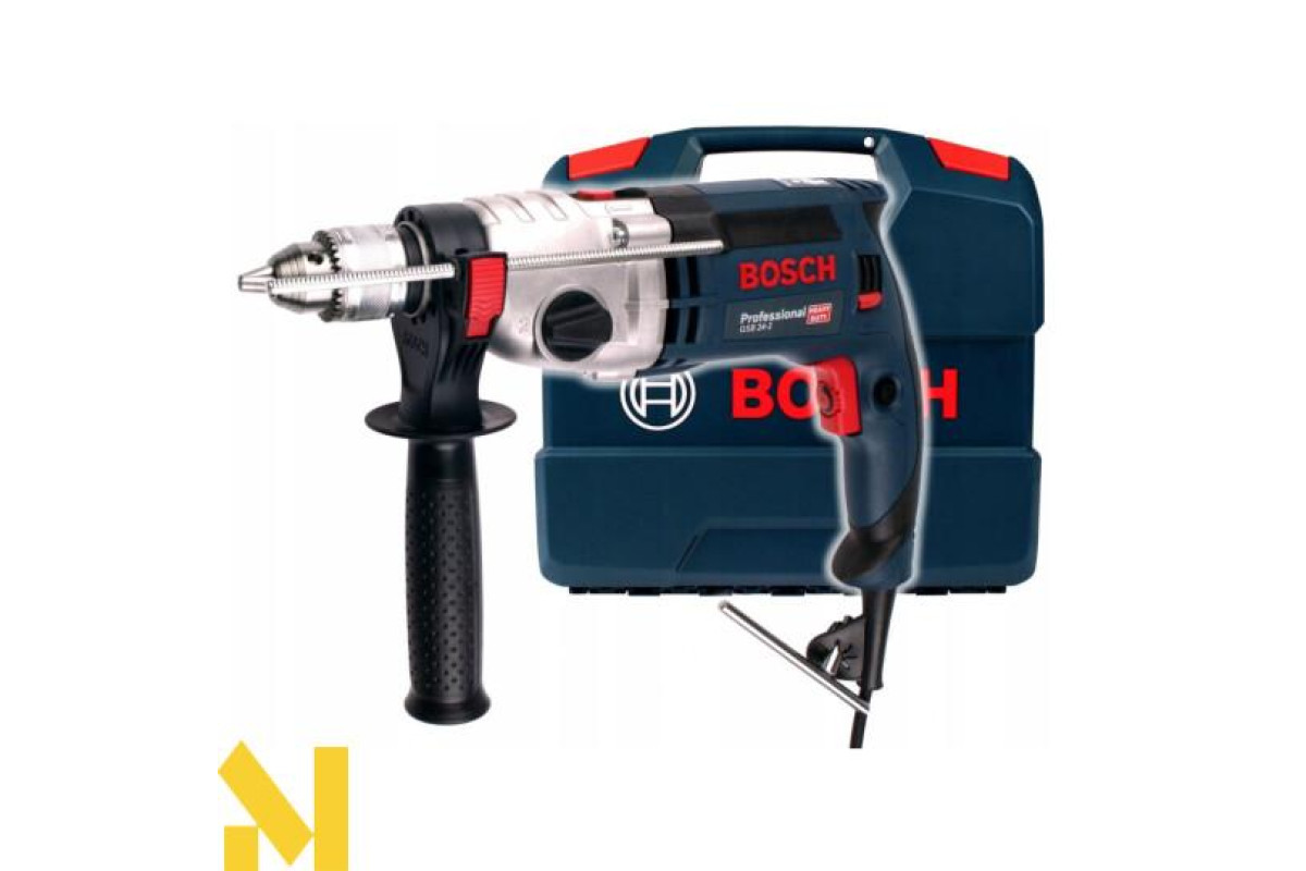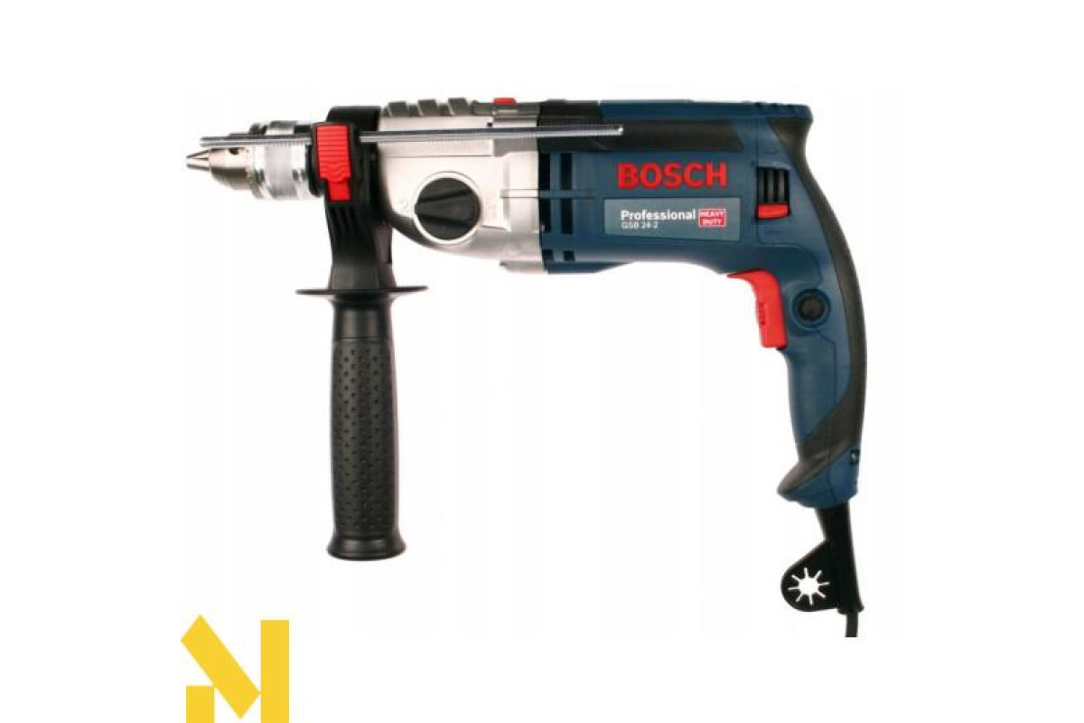 Ударний дриль Bosch GSB 24-2 потужністю 1100 Вт. Двохшвидкісна (0-900 / 3000 об/хв) з кулачковим патроном з діапазоном затиску 1,5-13 мм. Ударний механізм робить 0-15300/51000 уд/хв. Крутний момент 40 / 14,5 Нм. Різьба свердлильного шпинделя 1/2 "-20 UNF. Дриль виготовляє отвори в бетоні діаметром 22/13 мм, в камені і цегляній кладці - 24/16 мм, в деревині - 40/25 мм, металах - 16/8 мм. Доставляється в практичному L-Case з кулачковим патроном 13 мм, обмежувачем глибини (210 мм), додатковою рукояткою.