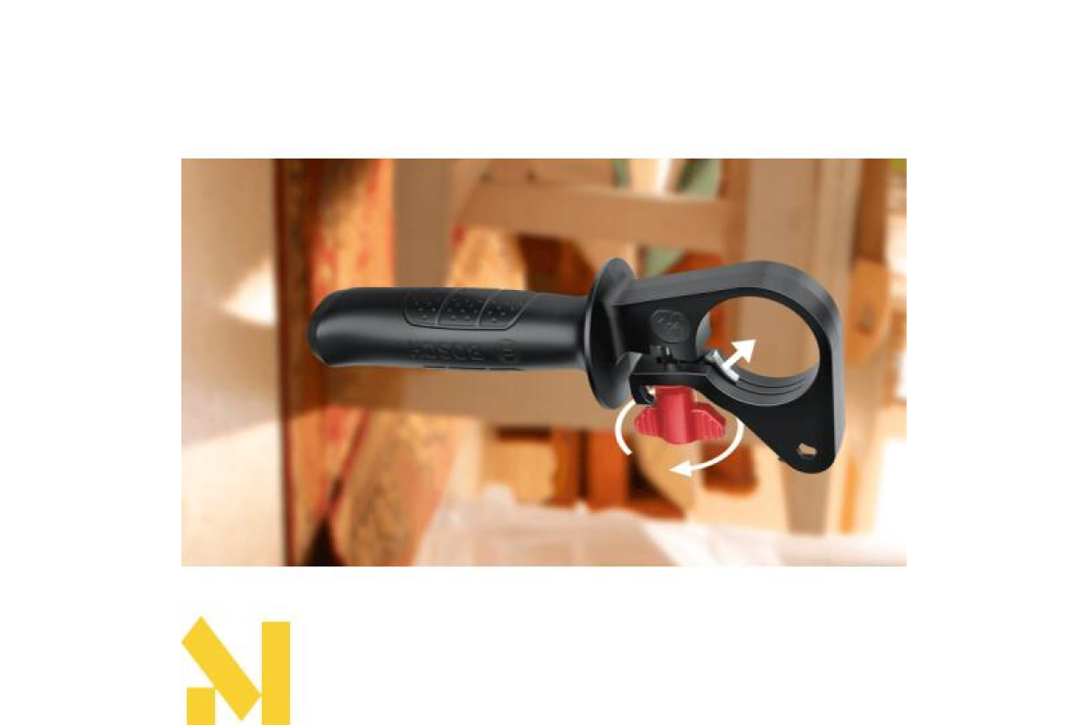 Зручна передня рукоятка з отвором під обмежувач глибини свердління легко монтується і з'їжджає під час роботи