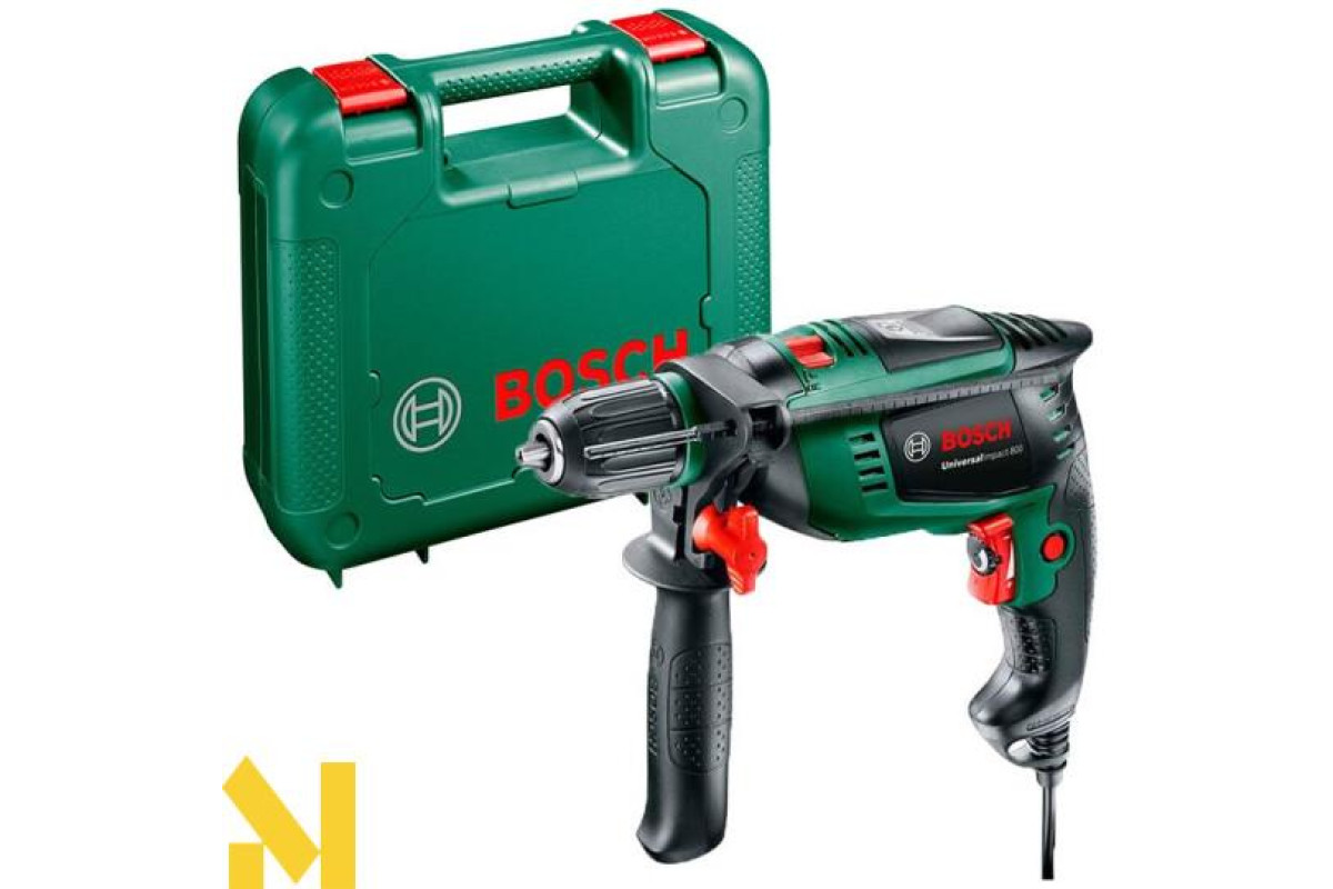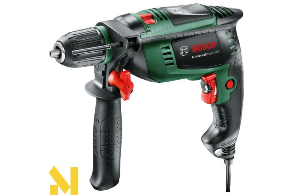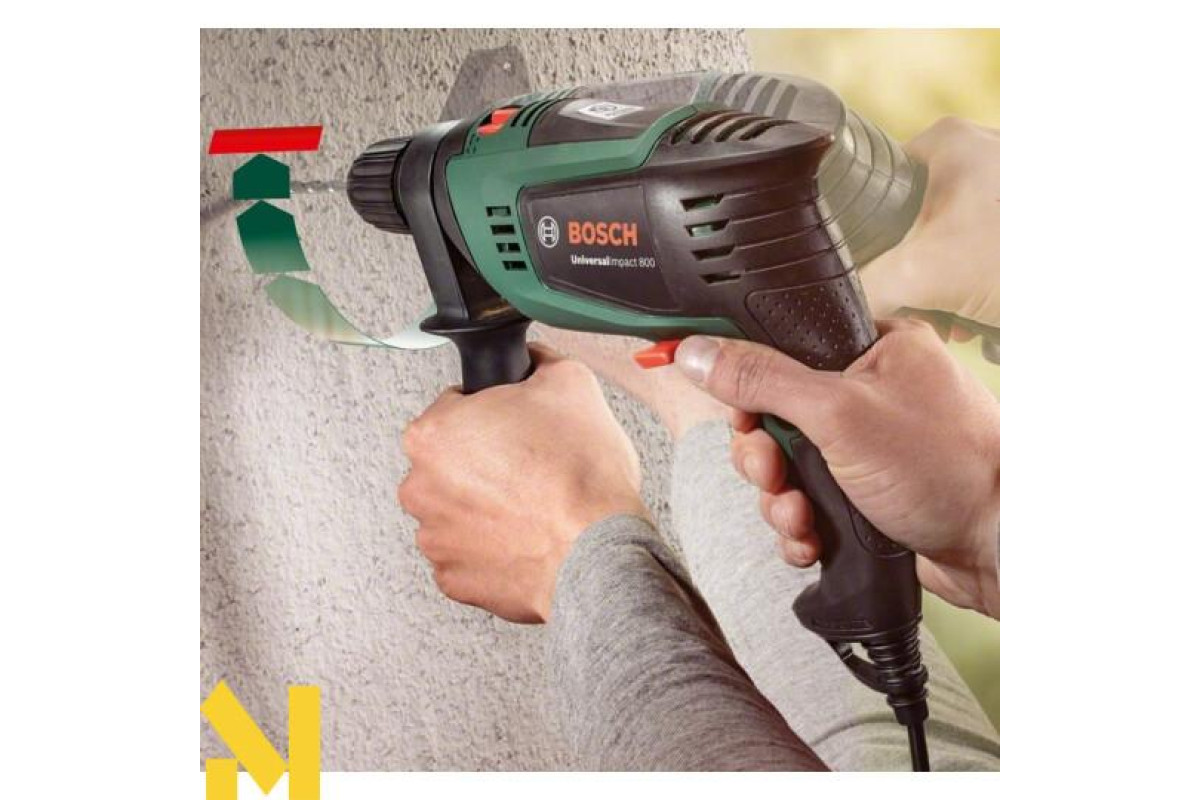 800 Вт дриль Bosch UniversalImpact 800 завдяки гарантованим 46500 уд/хв, регульованою швидкості (50-3100 об/хв), функції реверс, свердлить отвори в бетоні (14 мм), деревині (30 мм), металі (12 мм), закручує / відкручує шурупи (5 мм). Електроніка управління. Електронний стабілізатор. Система Kickback Control вимикає інструмент при блокуванні насадки. Швидкозатискний патрон 2-13 мм з автофіксації шпинделя Auto-Lock. Дриль доставляється в пластмасовій валізці з обмежувачем глибини, додатковою рукояткою.