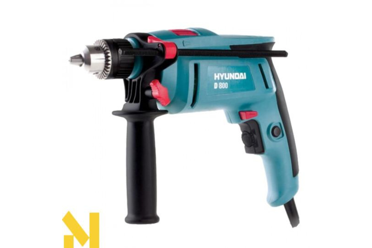 Дриль Hyundai D 800 має сучасний дизайн, що включає продуману ергономіку, гумові вставки і оптимально розташований центра ваги. Для серійного свердління є обмежувач глибини і фіксатор вимикача. А підібрати потрібну швидкість дозволить відповідний регулятор на вимикачі. Варто звернути увагу на наявність високочастотного ударного механізму, значно розширює сферу застосування інструменту. А надійно зафіксувати оснащення можна завдяки кулачковому патрону.