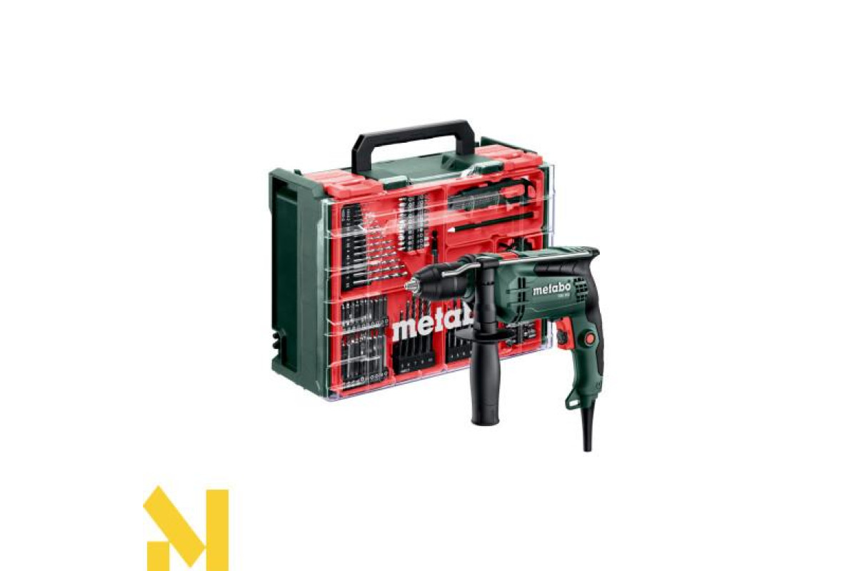 Ударний дриль Metabo SBE 650 Mobile Workshop оновлений легкий дриль у новому, ще зручнішому, Mobile Workshop кейсі з гарним набором необхідного для активної роботи оснастки.