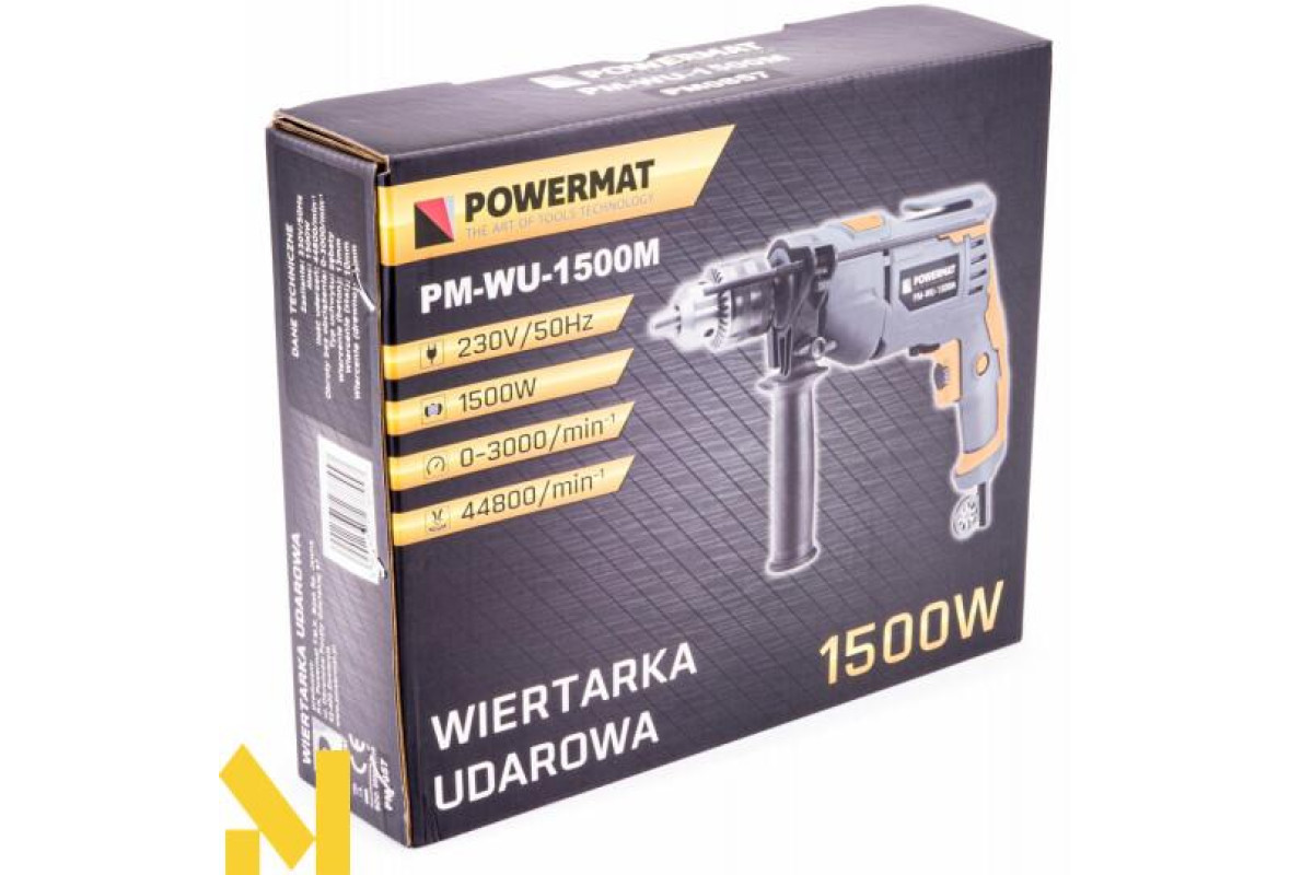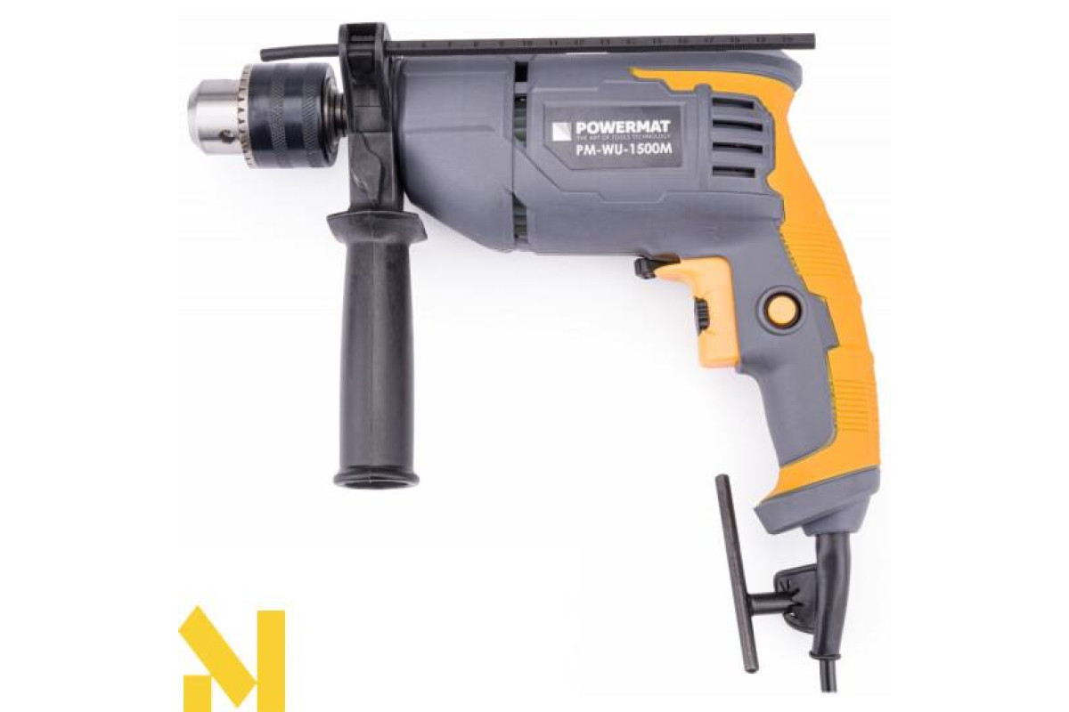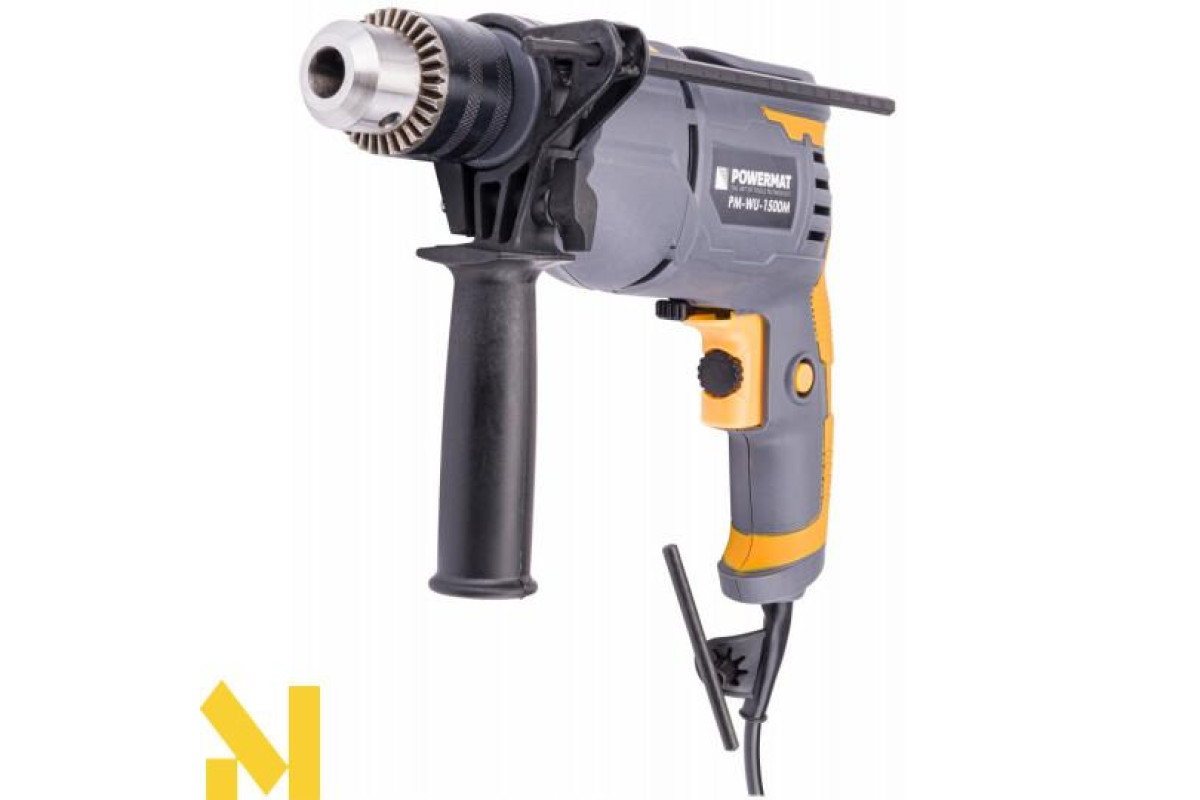 Електричний ударний дриль польської марки POWERMAT потужністю 1500Вт, призначений для ударного свердління в кам'яній кладці, бетоні та камені, а також для свердління в металі, кераміці, дереві та пластику.
