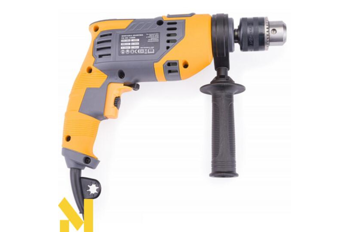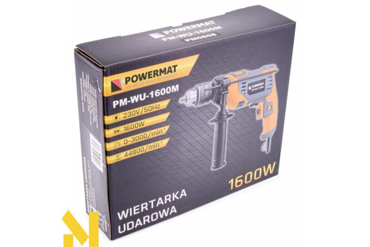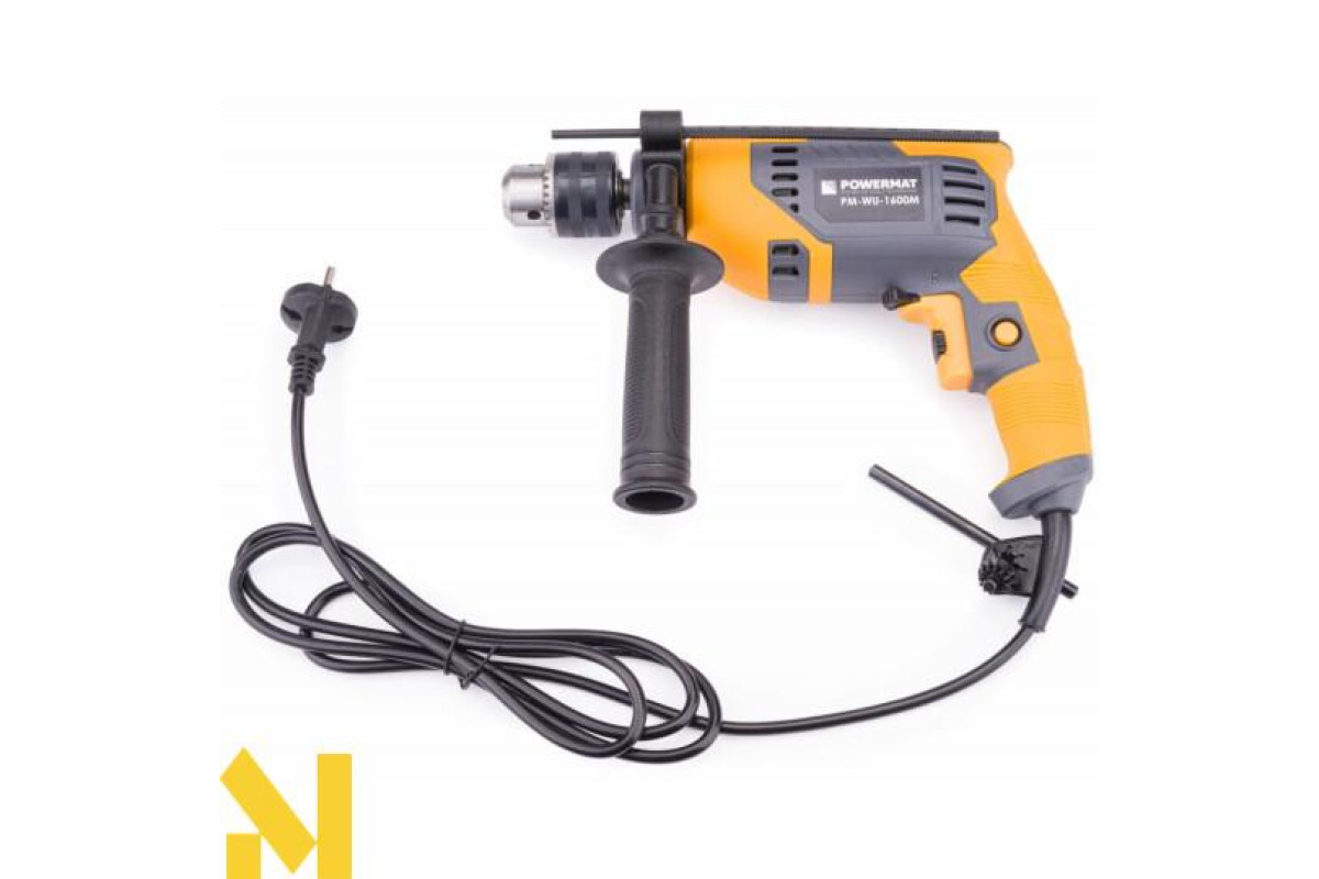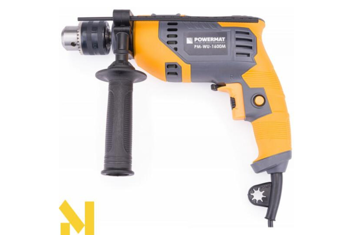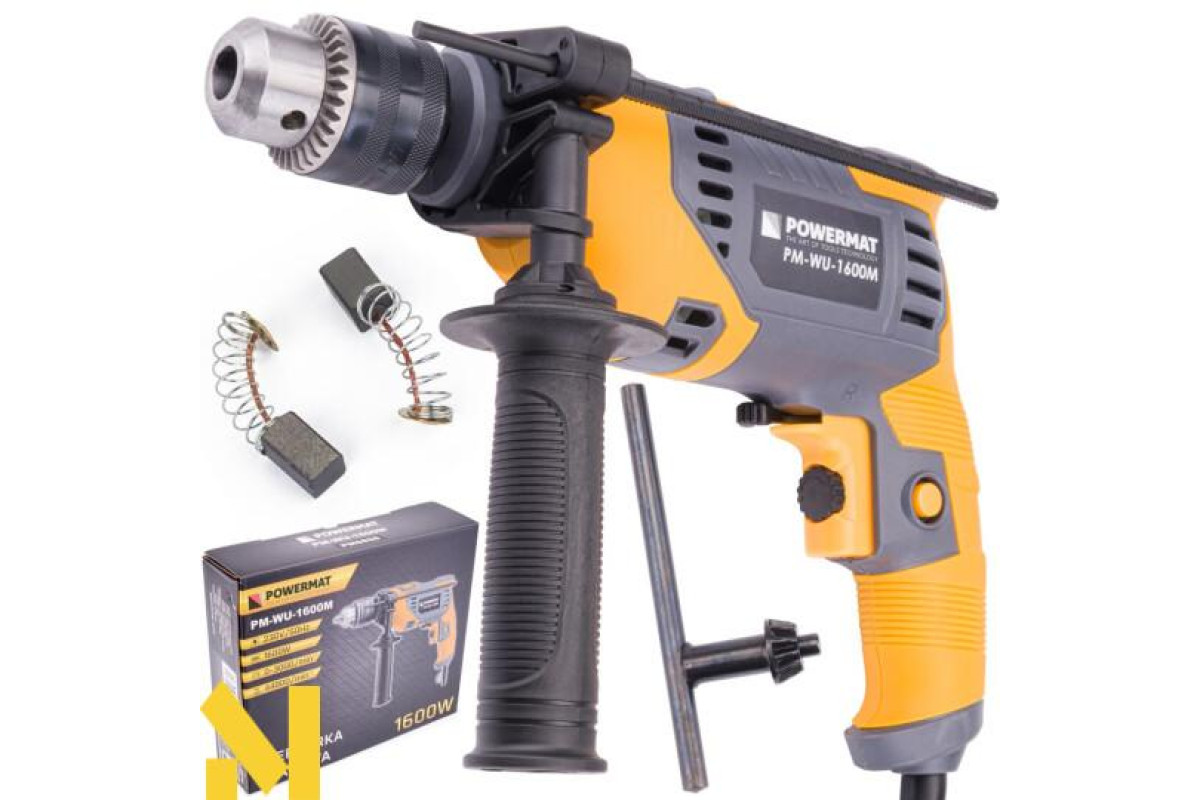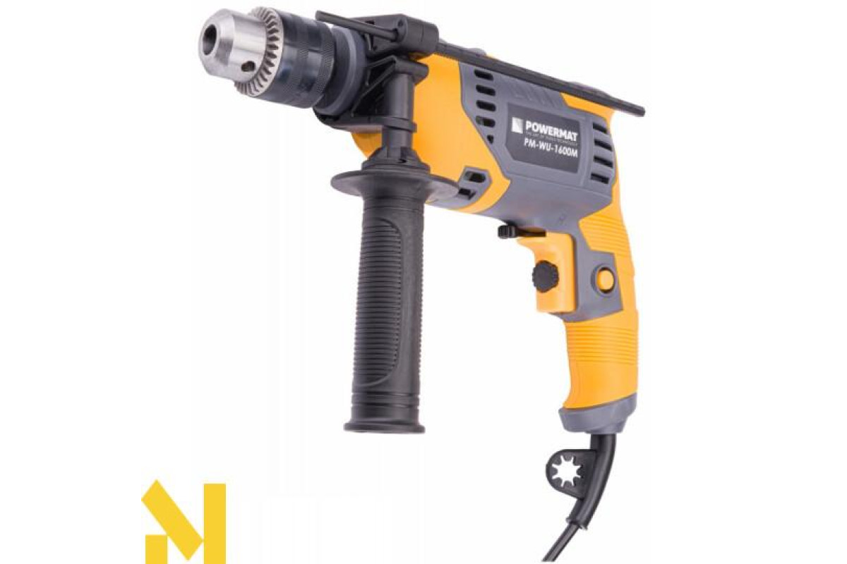 Електроударний дриль польської марки POWERMAT потужністю 1600 Вт призначений для ударного свердління стін, бетону та каменю, а також для свердління металу, кераміки, дерева та пластику.