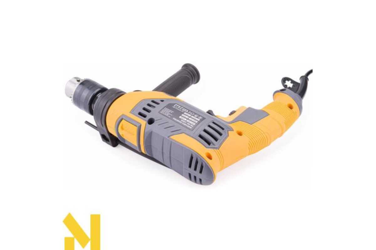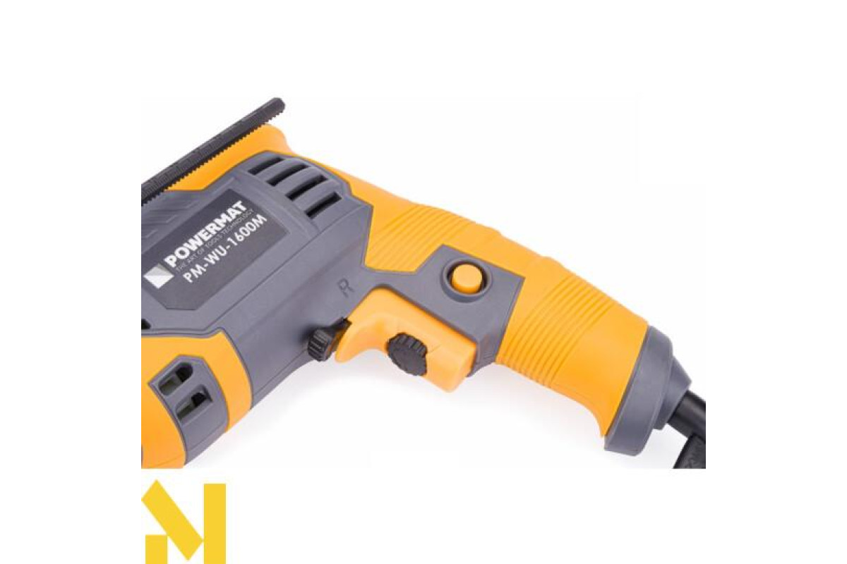 Дриль POWERMAT потужністю 1600 Вт оснащений плавним регулюванням швидкості та кнопкою, що забезпечує безперервну роботу, що значно полегшує роботу.