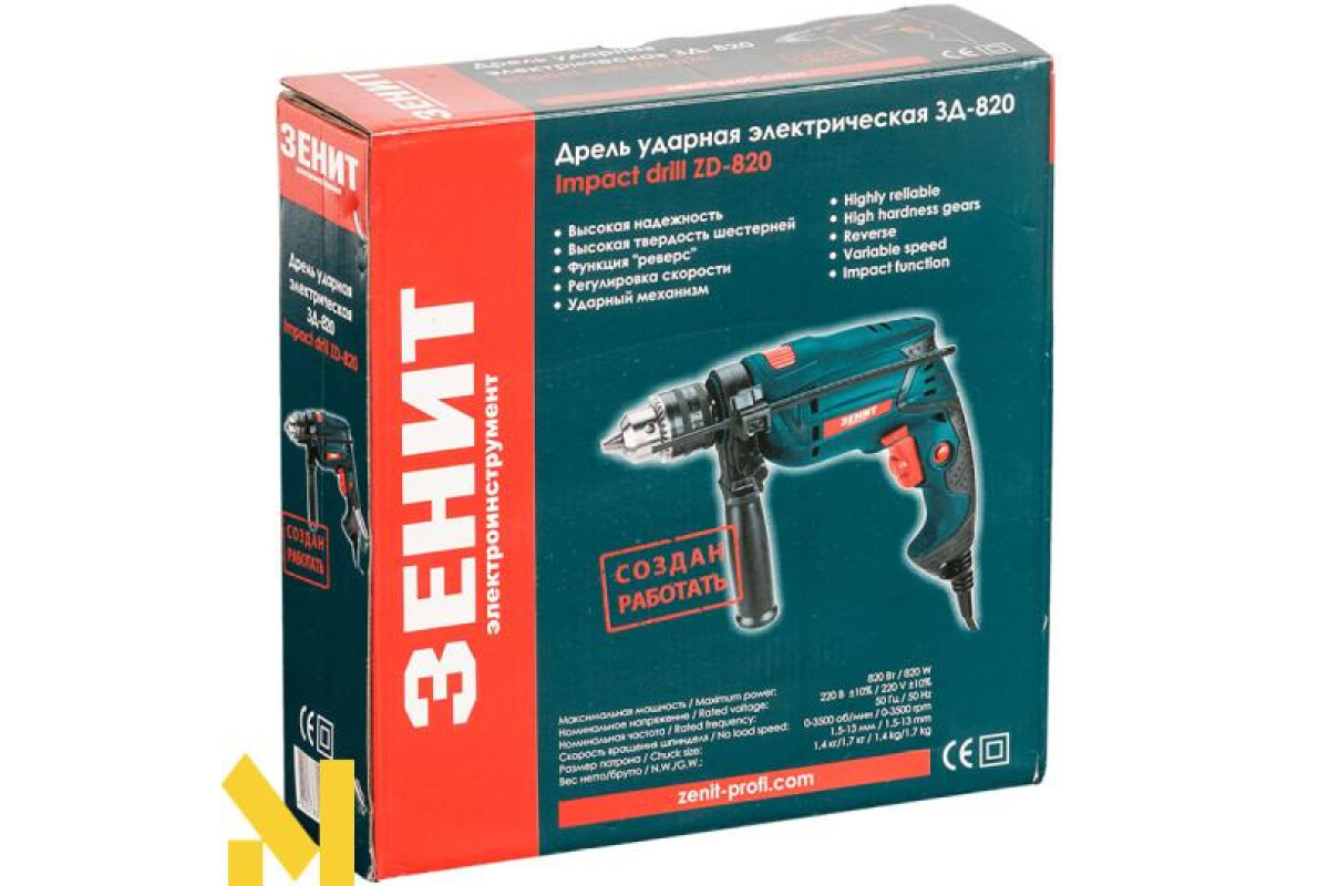 Зеніт ЗД-820 - дриль з функцією удару, яка успішно поєднує в собі кілька функцій. Вона може бути використана не тільки в будівництві, але і в багатьох інших сферах. Активно застосовується при необхідності штробления підстав, висвердлюванні отворів, виїмок, канавок.
