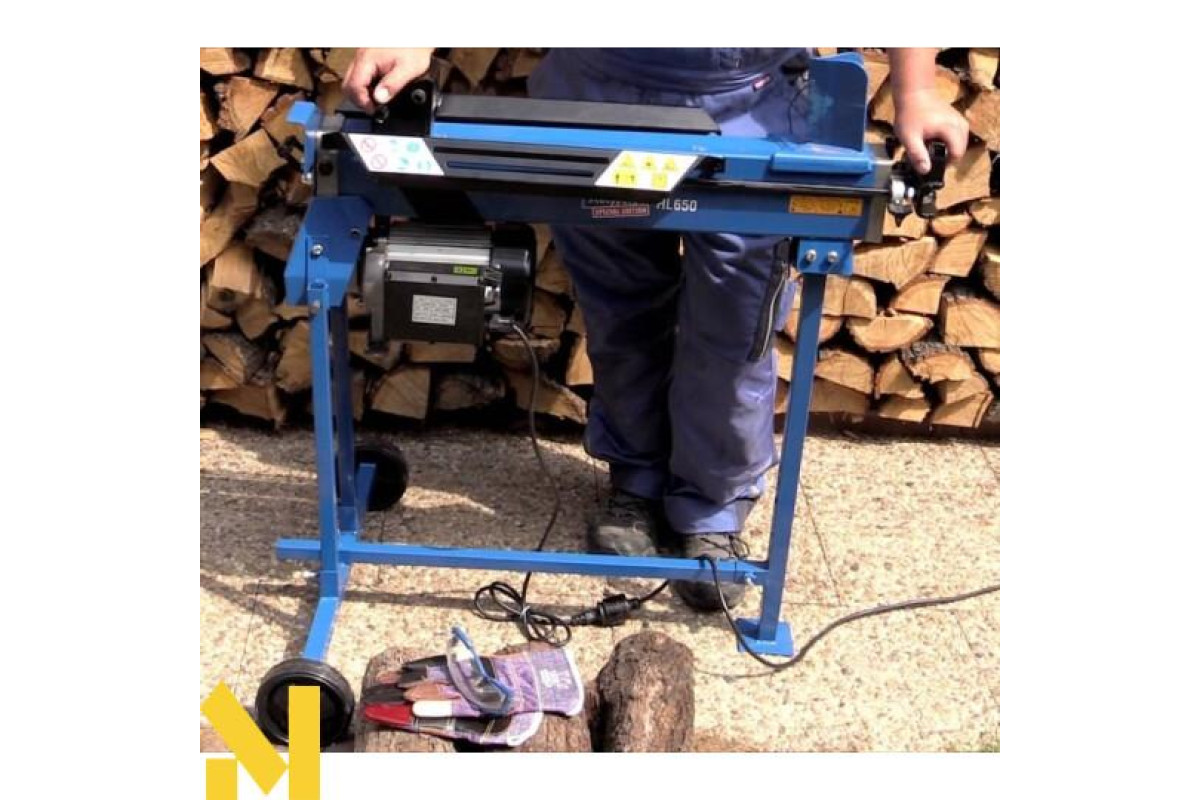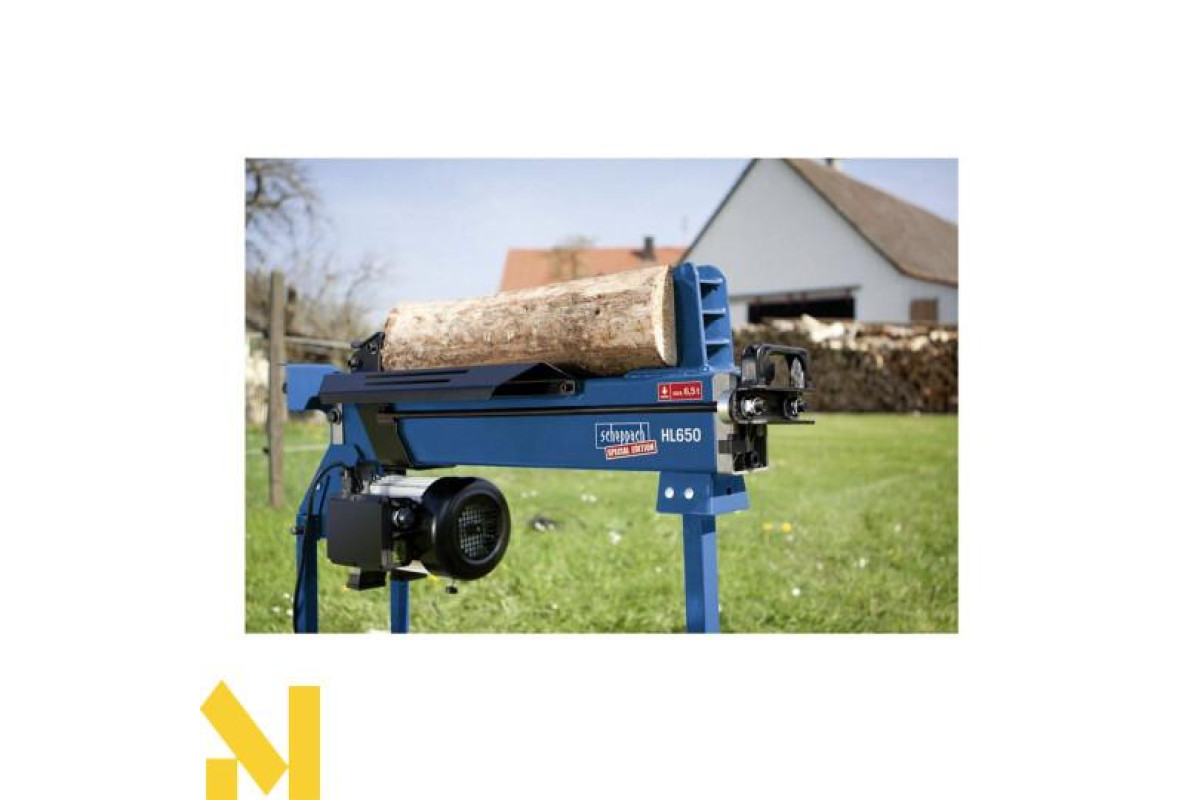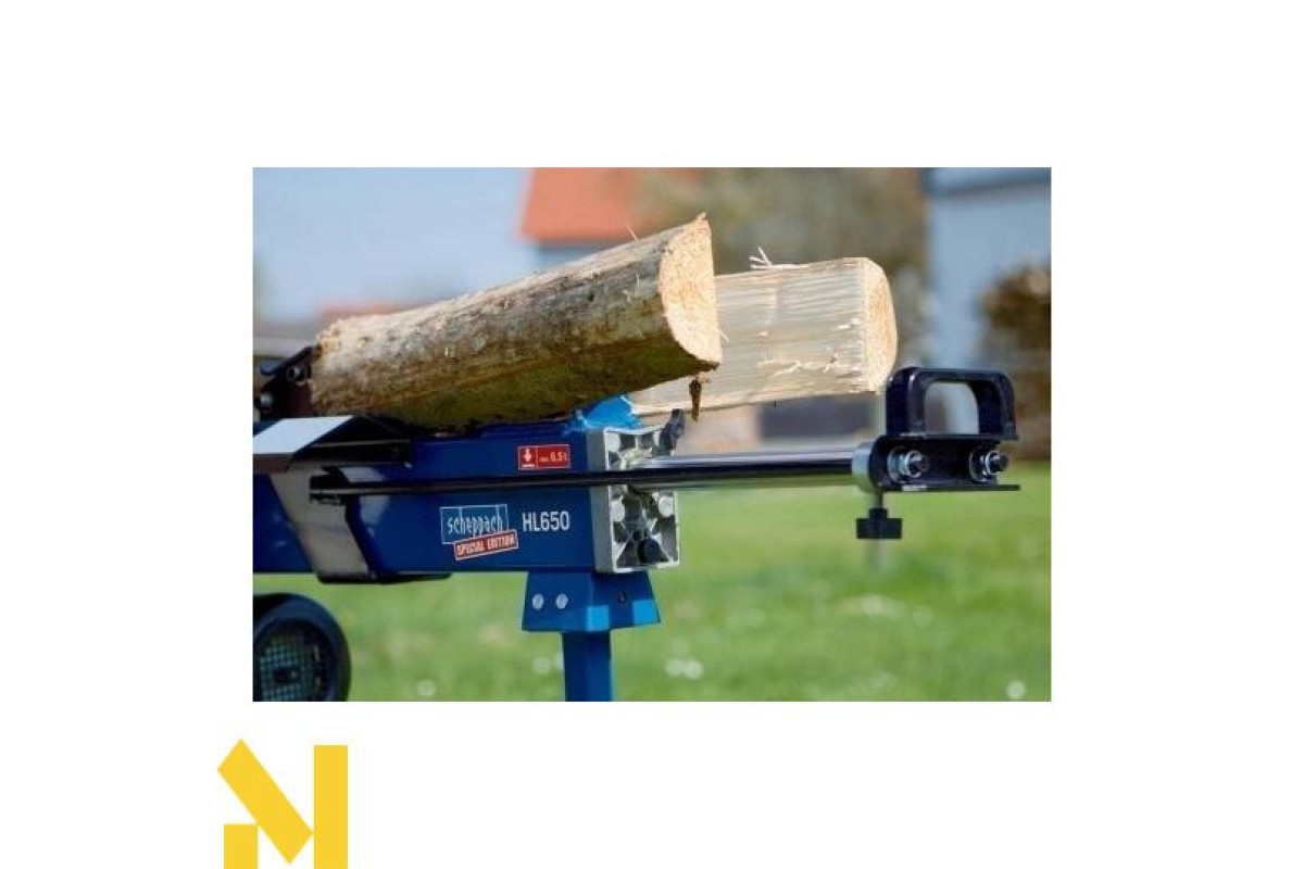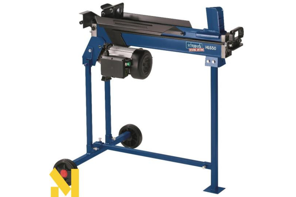 Дровокол Scheppach HL650 горизонтальної конструкції. Дана модель вважається найпотужнішою в своєму класі. Установка розроблена для застосування на заміській ділянці. Проста конструкція дозволяє власнику заготовити велику кількість дров для опалення печі або каміна. Можливо його застосування в дрібносерійному виробництві, на невеликих деревообробних майданчиках. Верстат замінить важкy фізичнy працю дроворуба, в рекордно короткі терміни i допоможе впоратися з великими обсягами. Швидкість руху колуна вперед становить 3 см / сек, а тому 8 см / с, відмінний показник. Максимальна довжина колоди може доходити до 52 см, а максимальний діаметр поліна 25 см.