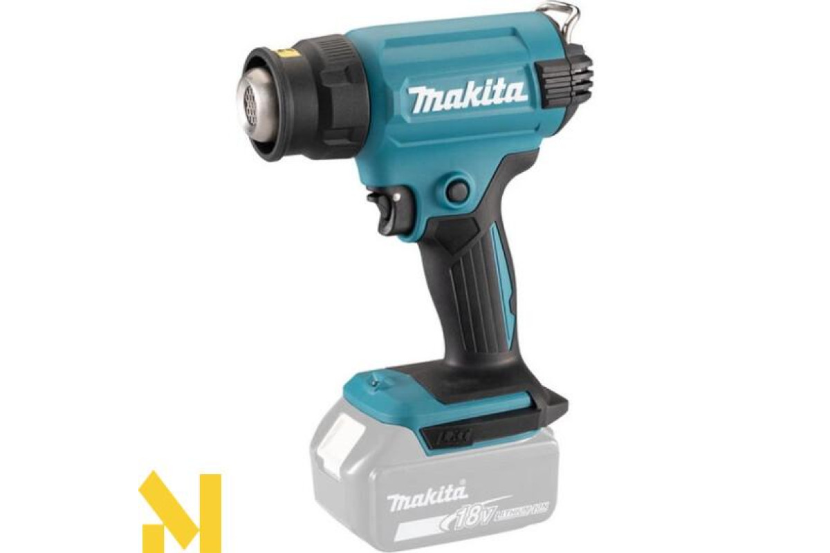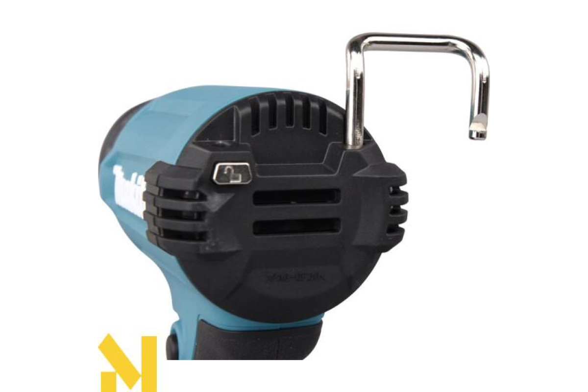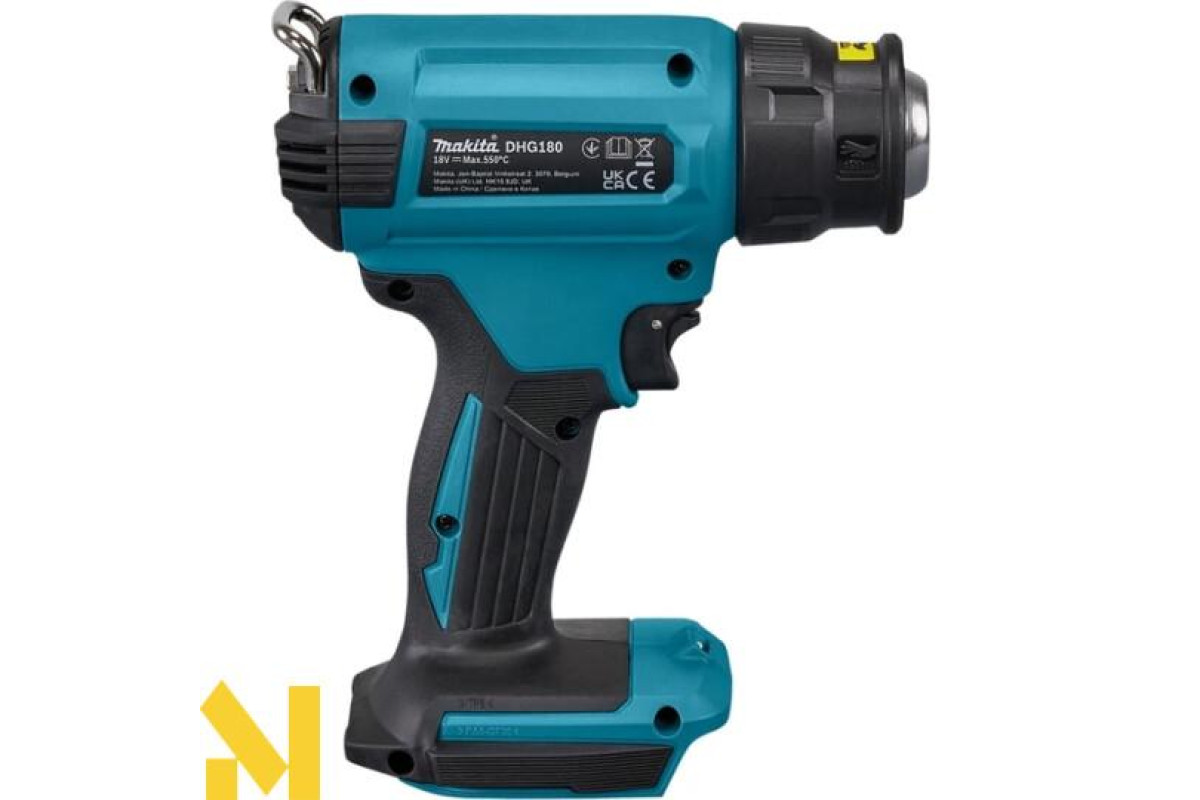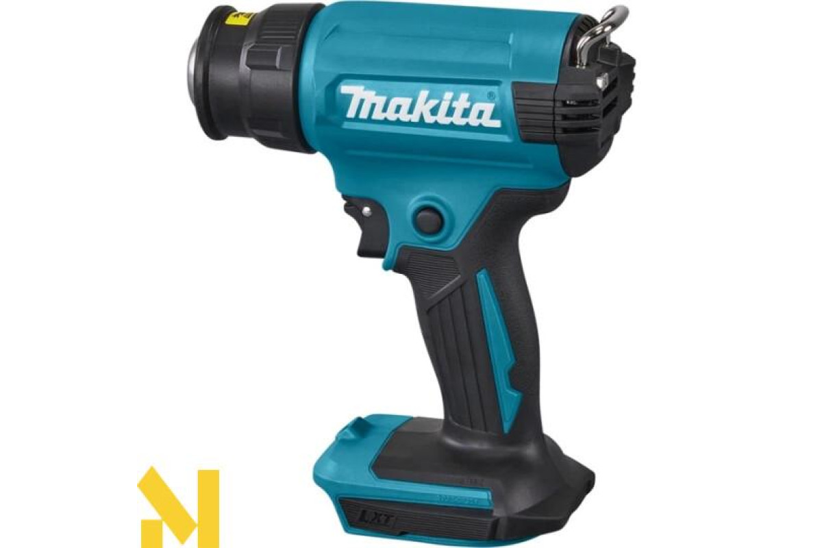 Будівельний фен акумуляторний MAKITA DHG180 живиться від літій-іонного акумулятора 18 В. Пристрій забезпечує постійну температуру 550°C та стабільний потік повітря, а також може працювати до 21 хвилини на одному заряді акумулятора BL1860B. Модель оснащена механізмом для швидкої заміни насадки без інструментів, гачком для підвішування інструменту та курком із блокуванням для безперервної роботи.