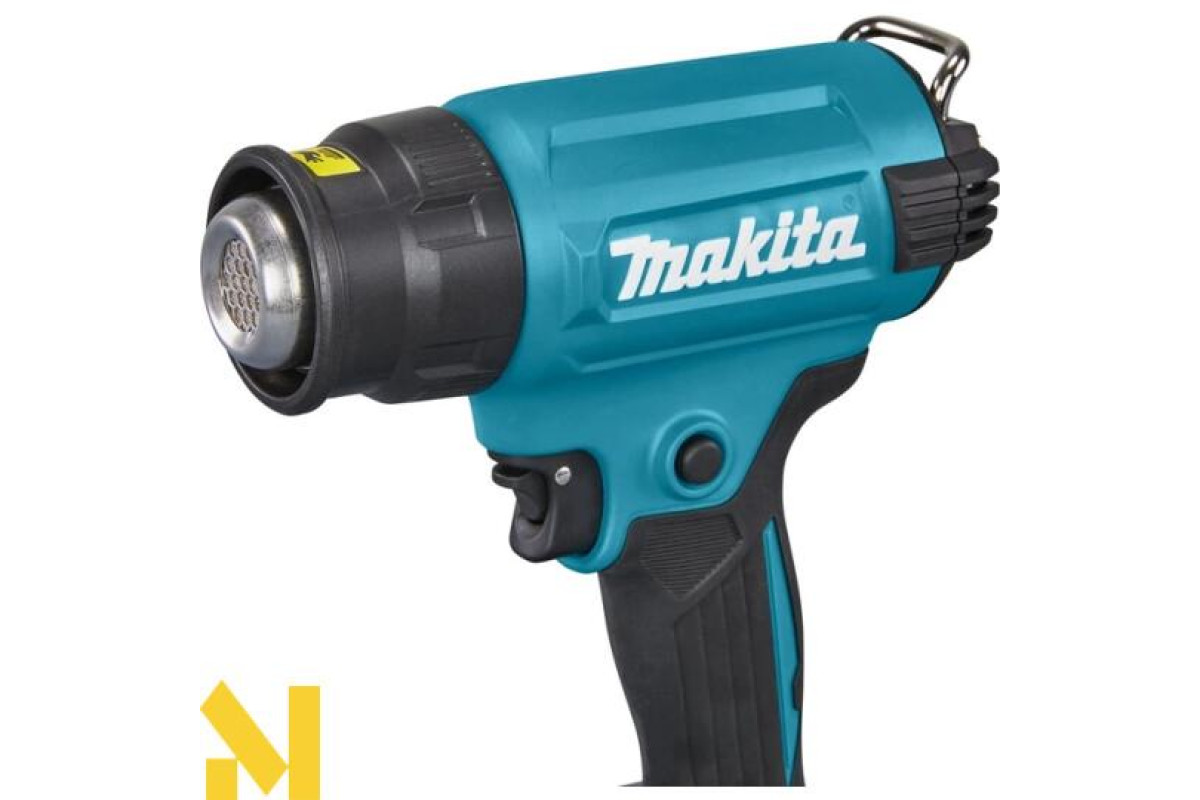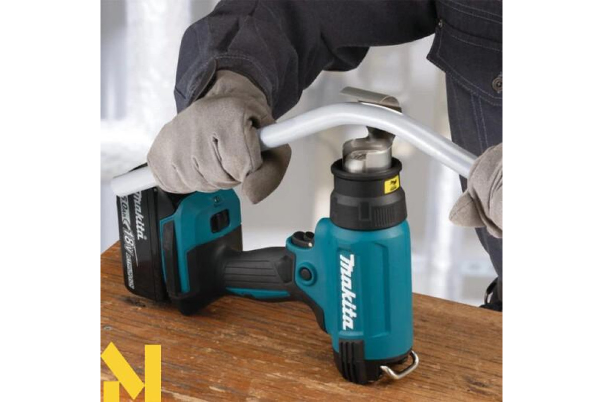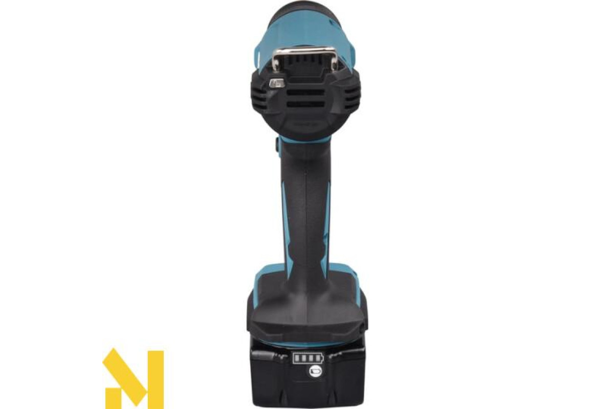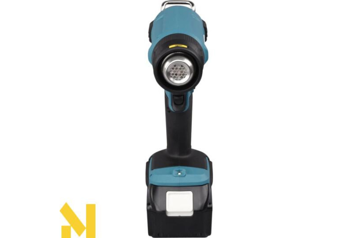 Будівельний фен акумуляторний MAKITA DHG180 живиться від літій-іонного акумулятора 18 В. Пристрій забезпечує постійну температуру 550°C та стабільний потік повітря, а також може працювати до 21 хвилини на одному заряді акумулятора BL1860B. Модель оснащена механізмом для швидкої заміни насадки без інструментів, гачком для підвішування інструменту та курком із блокуванням для безперервної роботи.