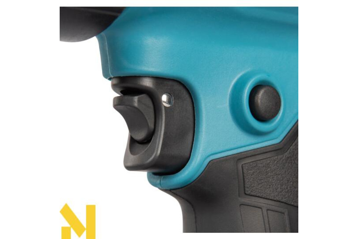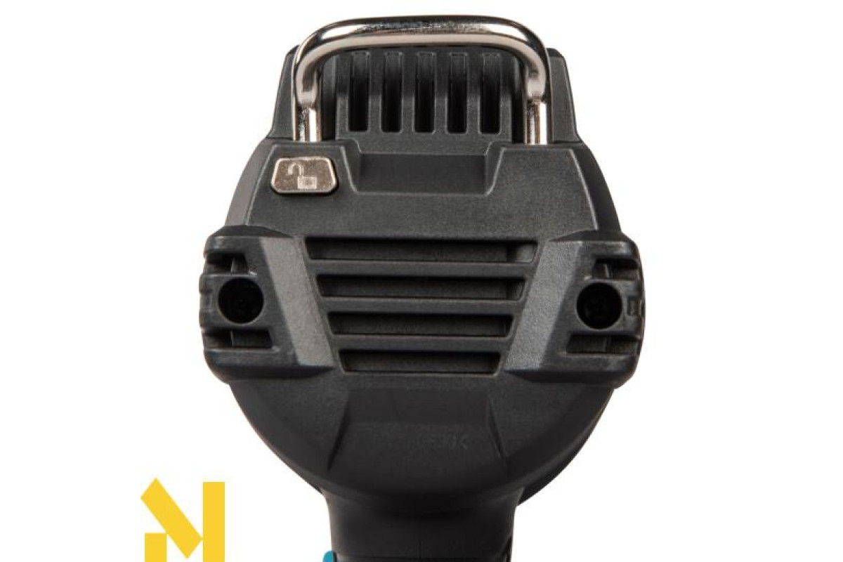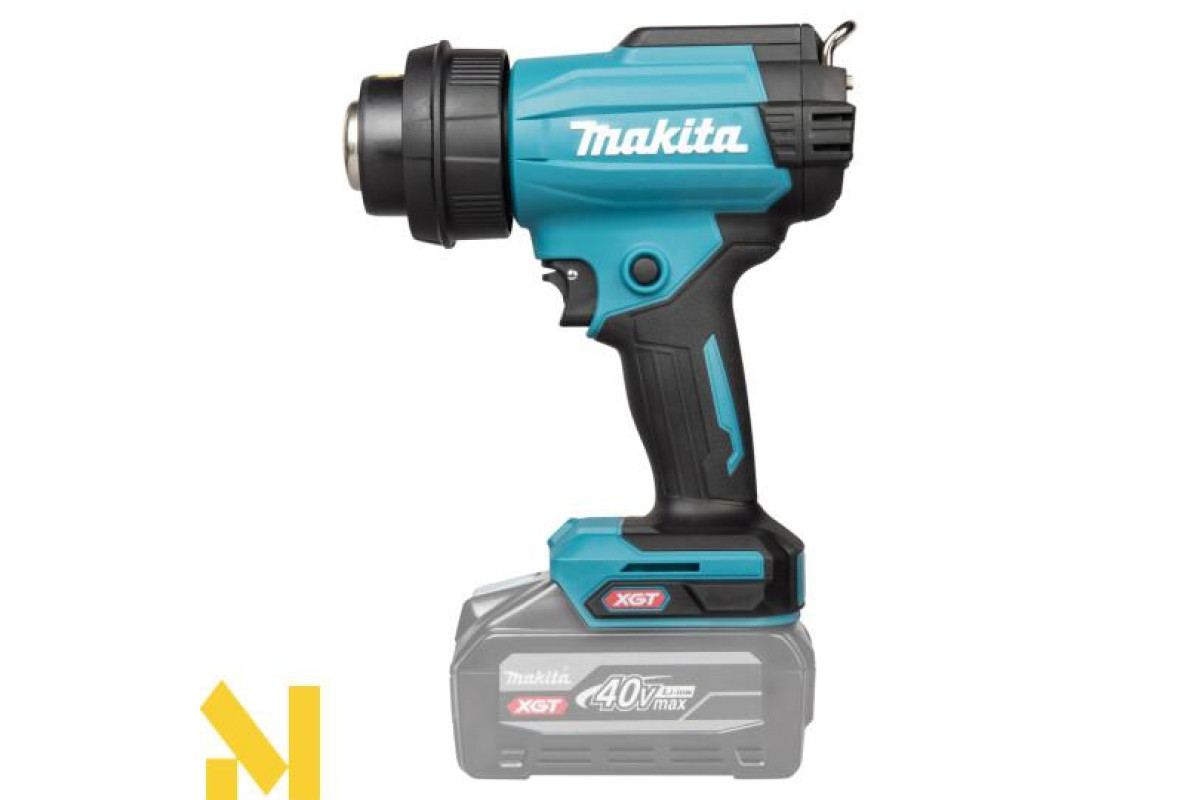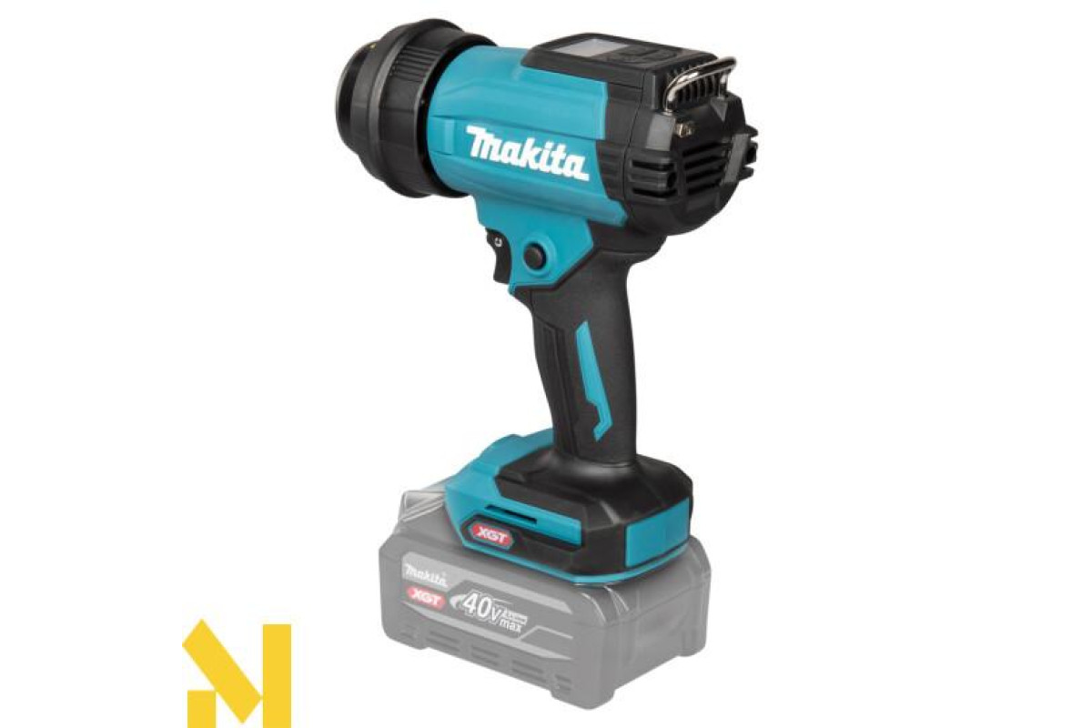 До 14 хвилин роботи на одному заряді акумулятора BL4040 (максимальні налаштування температури та потоку). Особливості включають підвісний гачок, блокувальний курок для безперервної роботи та блокувальний вимикач для запобігання випадковому спрацьовуванню.