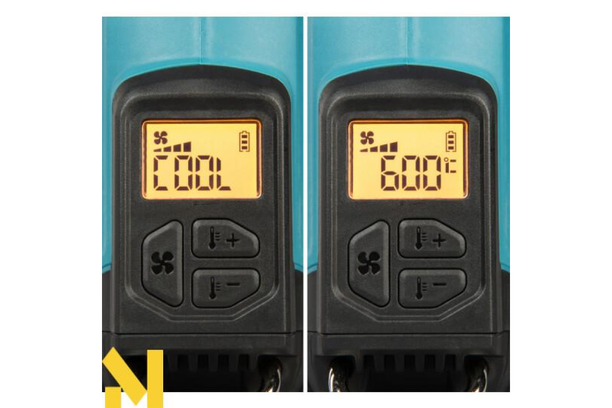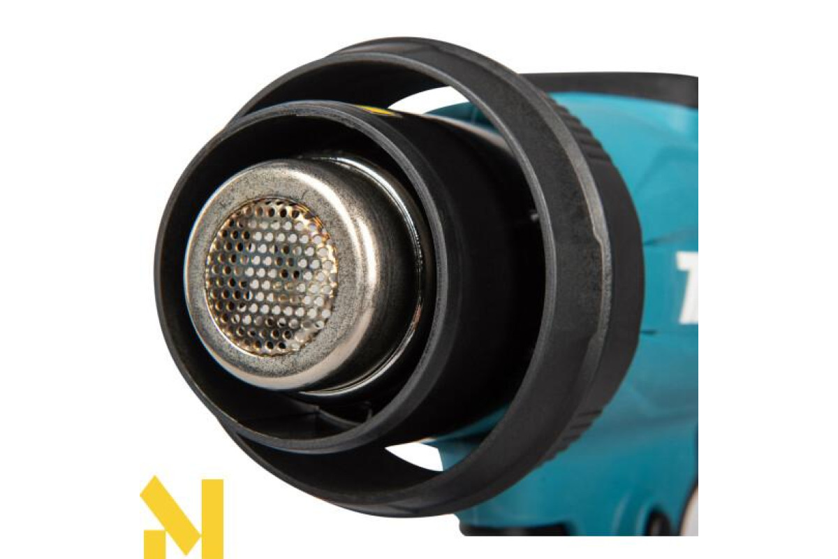 Температура повітря регулюється електронікою з кроком 10°C до максимуму 600°C. Він має чотири режими потоку повітря та функцію пам'яті, яка запам'ятовує останні налаштування потоку повітря та температури. Він оснащений механізмом для швидкої заміни сопел без інструментів. Сумісний з поточним асортиментом дротових сопел теплових гармат.