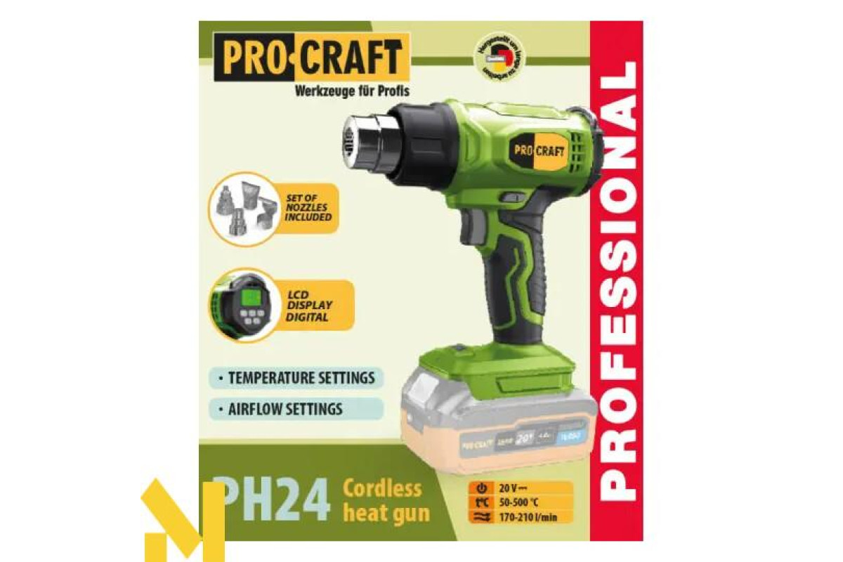 Акумуляторний термопістолет Procraft PH24bb - це сучасний і потужний пристрій, ідеально підходить для широкого спектру застосувань, включаючи видалення старої фарби, пайку, розморожування труб або роботу з термозбіжною плівкою.