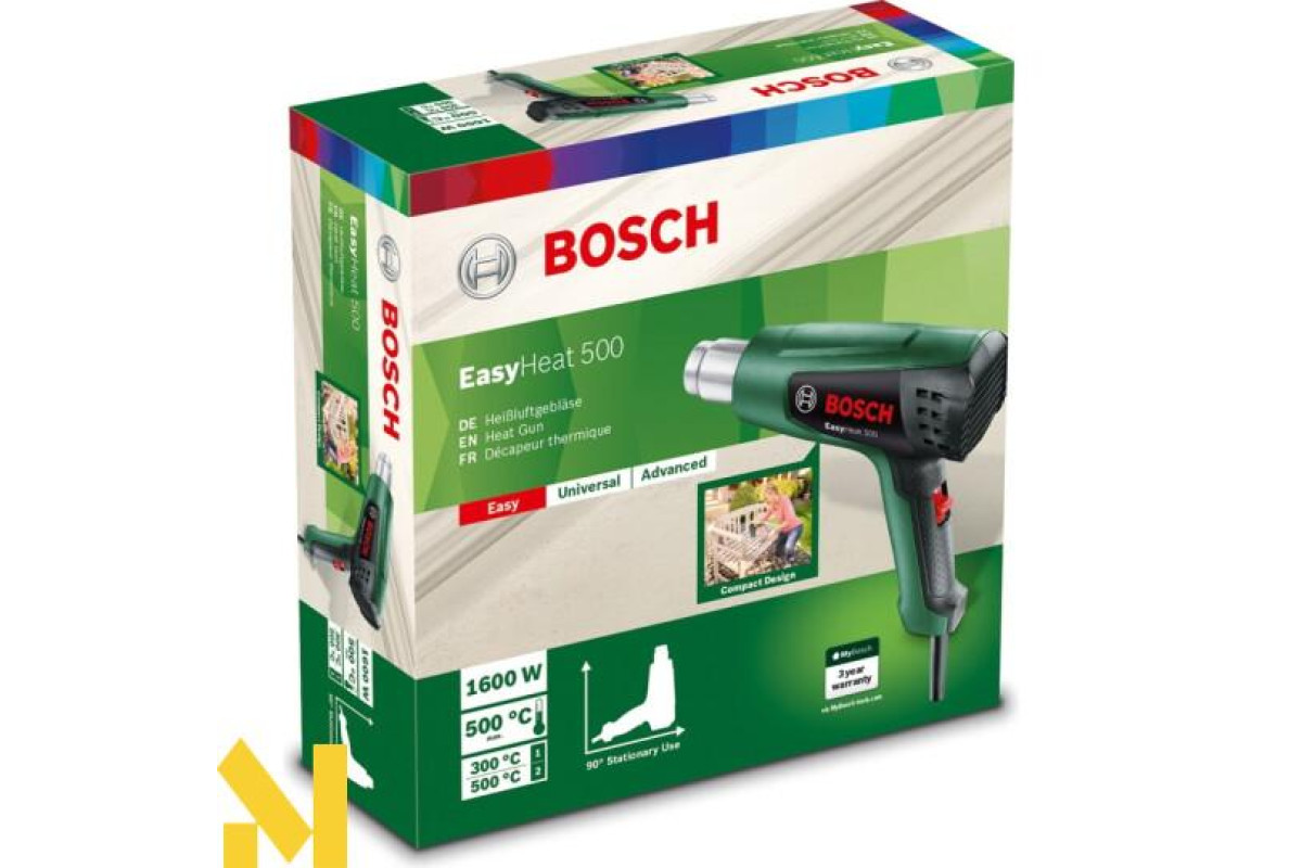 Цей компактний промисловий фен забезпечує впевненість у роботі. EasyHeat 500 має легку компактну конструкцію та зручну область ручки для легкої та ергономічної роботи. Простий інтерфейс користувача має два значки налаштування температури для простого вибору правильного режиму залежно від застосування. Додатково у нього також є гумована нековзка задня сторона, щоб інструмент можна було надійно поставити. Промисловий фен може впоратися з багатьма завданнями завдяки різноманіттю насадок, наприклад, видалення фарби, розморожування водяних труб, знищення бур'яну, усадка кабелю, а також творчі проекти.