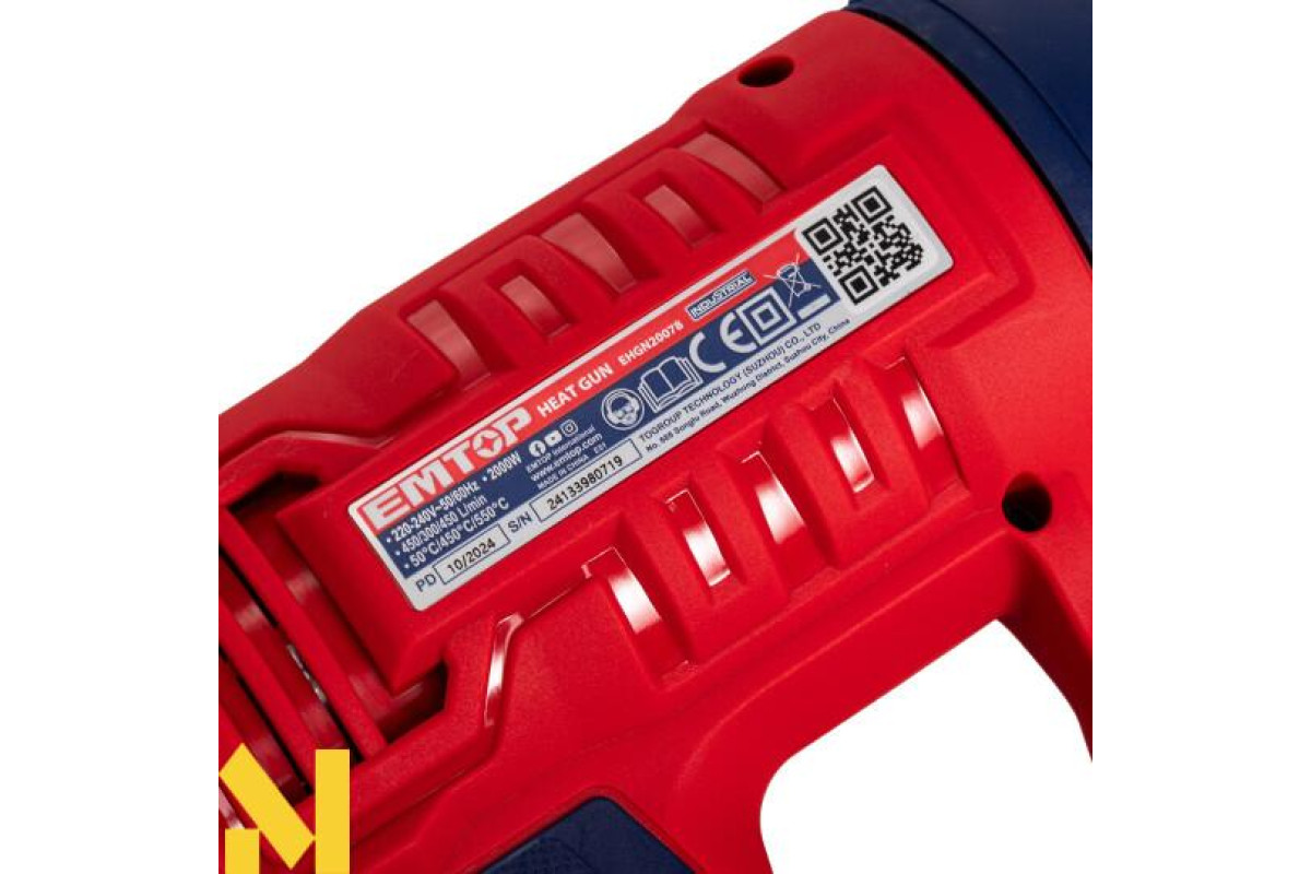 Технічний фен Emtop EHGN20078 — це надійний та потужний інструмент для виконання різноманітних завдань, пов'язаних із нагріванням, розм'якшенням або обробкою різних матеріалів. Зручний і ефективний, цей фен ідеально підходить для будівельних, ремонтних та господарських робіт, а також для домашнього використання.