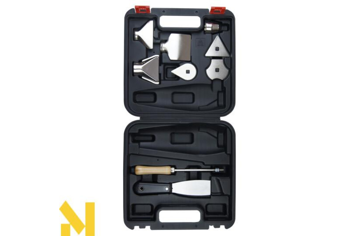 Упакований у практичну валізу для перенесення із пластику з численним додатковим приладдям: щілинна насадка, насадка для подачі струменя, насадка із захисним склом, змінна насадка, скребок