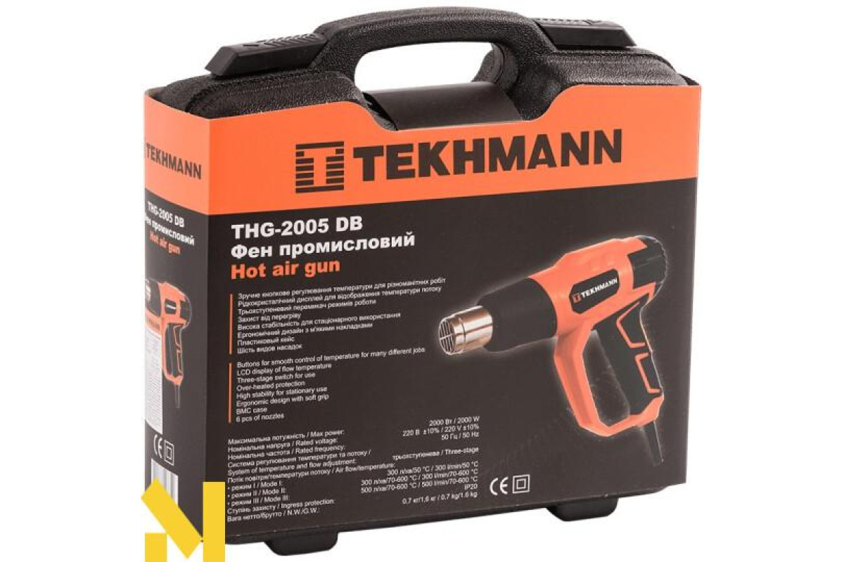Tekhmann THG-2005 DB (847040) якісний промисловий фен, який застосовується, переважно, на будівельних майданчиках і при ремонтах. Основне призначення даного приладу обробка різнорідних поверхонь струменем гарячого повітря з метою її очищення від старої фарби, лаку, іржі та інших недоліків.