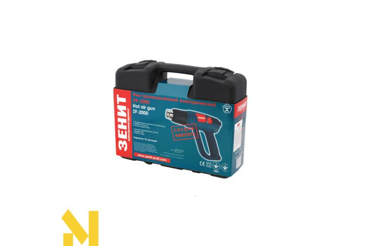 Пластиковий кейс.ЗФ-2000 / ЗФ-2000-1 має дві швидкості повітряного потоку з можливістю плавного регулювання температури потоку в інтервалі від 50 ° C до 300 ° C на першому режимі і від 90 ° C до 600 ° C на другому. Швидкість повітряного потоку першого режиму становить 250 л / хв, а другого режиму - 500 л / хв. Плавне регулювання температури повітряного потоку здійснюється регулятором на бічній панелі корпусу фена. Перемикач режимів розташований на тильній стороні рукоятки. Модель має ергономічну D-образну рукоятку, особливість якої полягає в тому, що вона захищає пальці руки від попадання відбитої струменя гарячого повітря і бризок розігрітого матеріалу.
