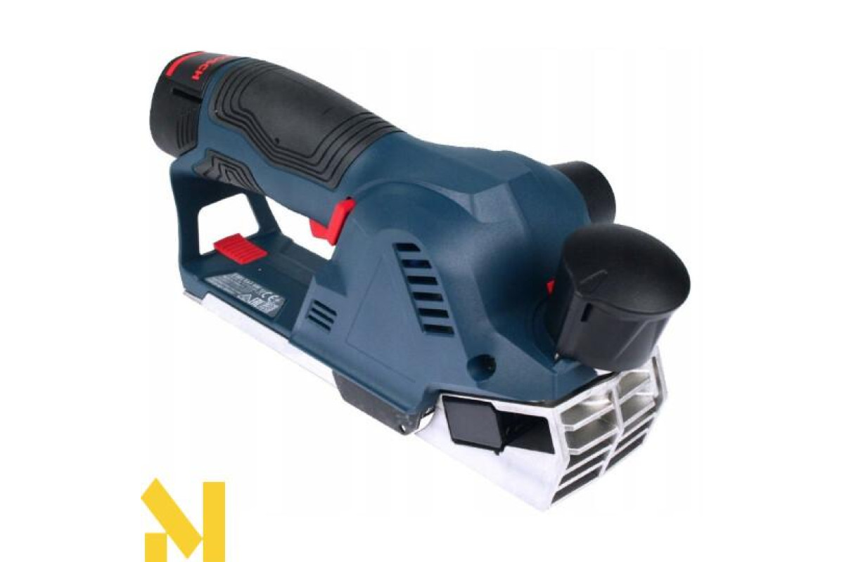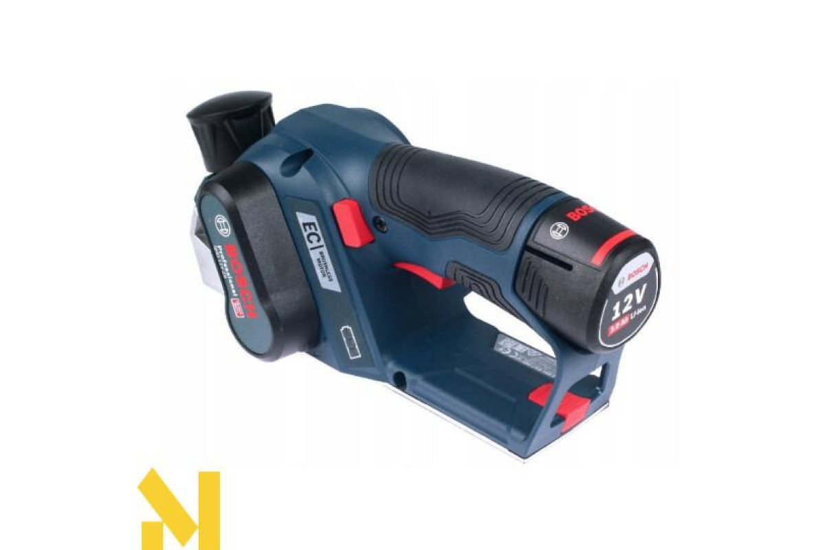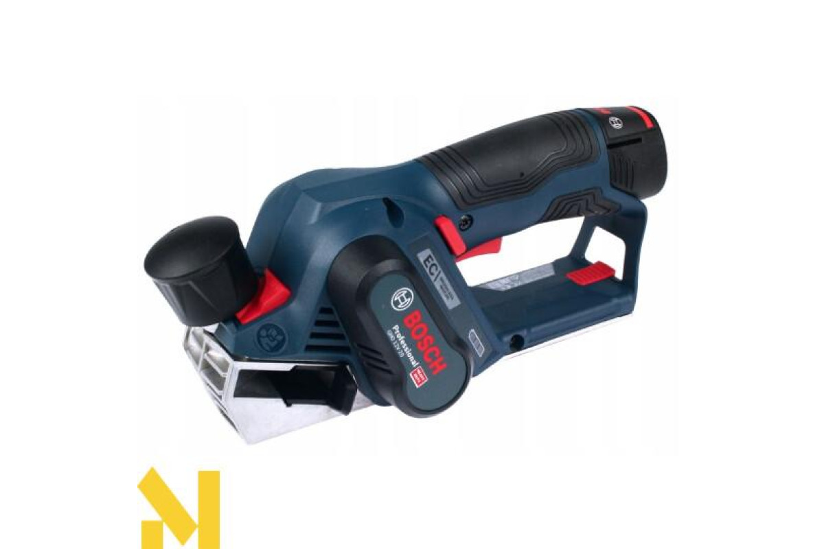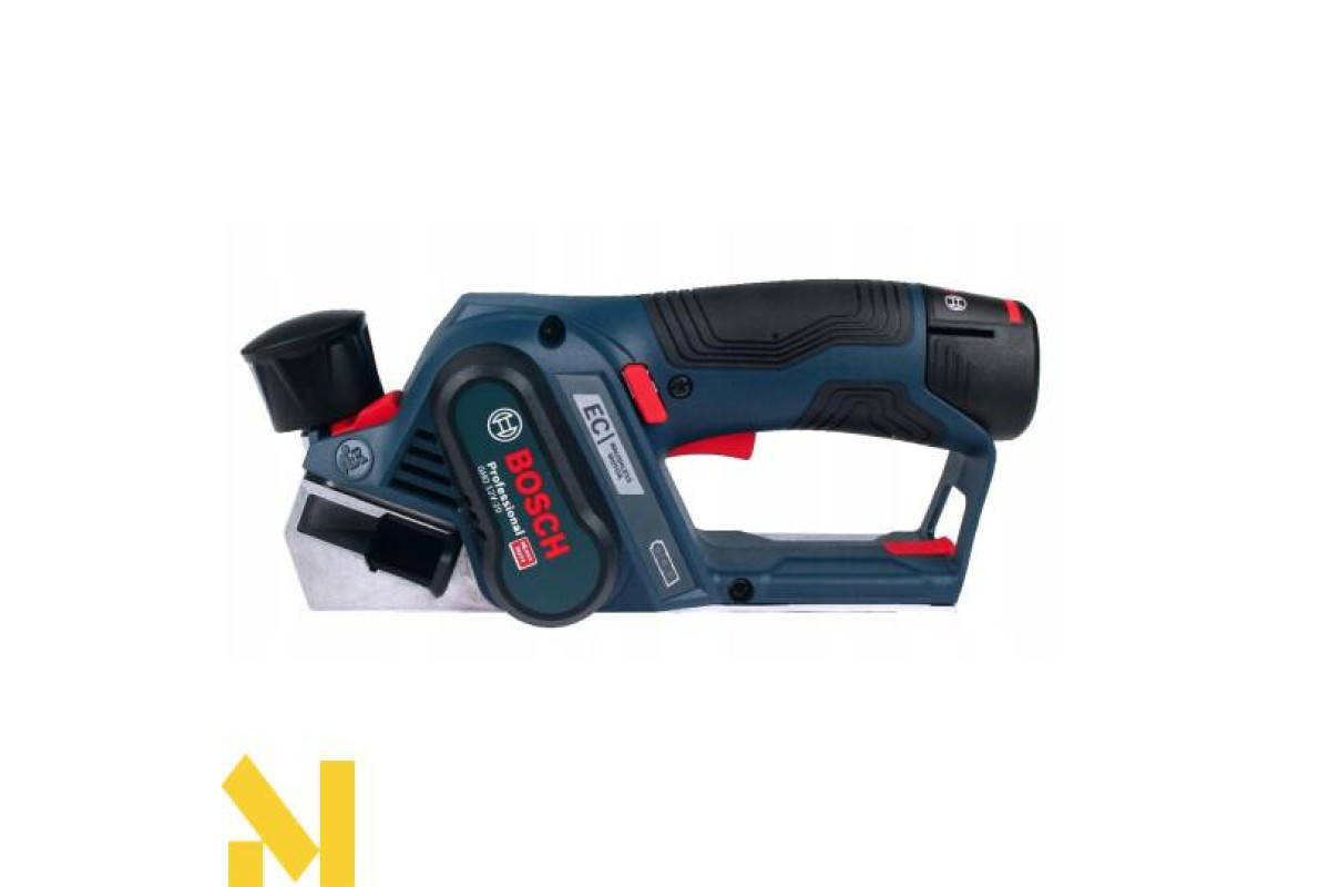 Акумуляторний рубанок Bosch GHO 12V-20 професійної серії призначений для стругання деревних матеріалів, балок, дощок, що лежать на міцній опорі. З його допомогою можна ефективно скошувати кромки, робити вибірку чверті. Рубанок з рабою шириною 56 мм забезпечує глибину стругання 0-1 мм (оптимальне значення), 1-2 мм (максимальна). Вибірка чверті можлива глибиною до 17 мм. Функціонує від Li-Ion 12 В акумулятора Особливий ергономічний, компактний дизайн, оптимальне розміщення центру ваги, легка вага (1,7 кг) дозволяють зручно працювати в будь-якому місці. Li-Ion акумулятори дозволяють назавжди забути про саморозряд і ефекті пам'яті. Електронний захист від глибокої розрядки ECP. Індикатор зарядженості. Безщітковий двигун забезпечує тривале і безперебійне стругання зі швидкістю 14500 хід/хв. Рубанок оптимізований для роботи при глибині стругання 1 мм. За допомогою поворотного регулятора можна регулювати це значення 0-1 мм. Для установки глибини більше 1 мм, можна скористатися кнопкою для збільшення глибини стругання. Фаска з кромки заготовки знімається за допомогою розташованого в передній частині підошви V-образного паза. Для стругання застосовуються оригінальні ножі з твердого сплаву HM / TC з двома лезами. Коли одне лезо затупітся, ніж можна повернути. Якщо затупились обидва леза, ніж повинен бути замінений. Заміна строгального ножа відбувається за допомогою шестигранного штифтового ключа, який знаходиться в спеціальному відсіку рубанка. Оптимальний центр ваги для зручного і ергономічного звернення. Система пиловидалення з патрубком для викиду стружки, можливістю підключення пилососа.
