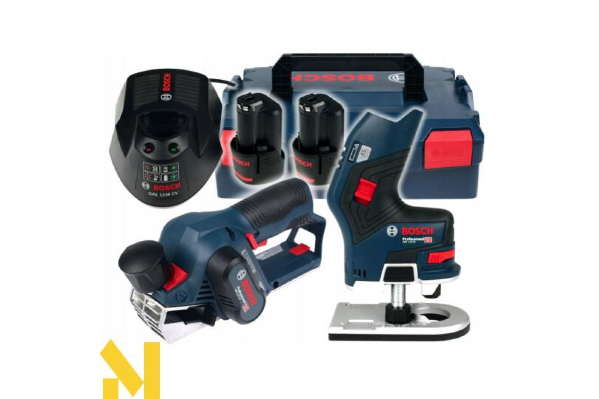 Фрезер Bosch GKF 12V-8 в інноваційному дизайні - перший в професійній серії, що працює на Li-Ion акумулятори 12 В. Практичний і маневрений, здійснюючи 13000 об/хв, з максимальним діаметром фрезерування 36 мм фрезерує в деревині, пластмасі і легких неметалевих будматеріалах кромки і профілі. Глибина фрезерування налаштовується. Зажимная цанга 6 мм, 8 мм, ¼ дюйма. Приводиться в дію Li-Ion 12 В акумулятором, рубанок Bosch GHO 12V-20 Professional зі стругальними ножами 56x5,5x1,1 мм, які здійснюють 14500 хід/хв, струже деревні матеріали на глибину до 2 мм. Глибина вибірки чверті до 17 мм. Робоча ширина 56 мм.