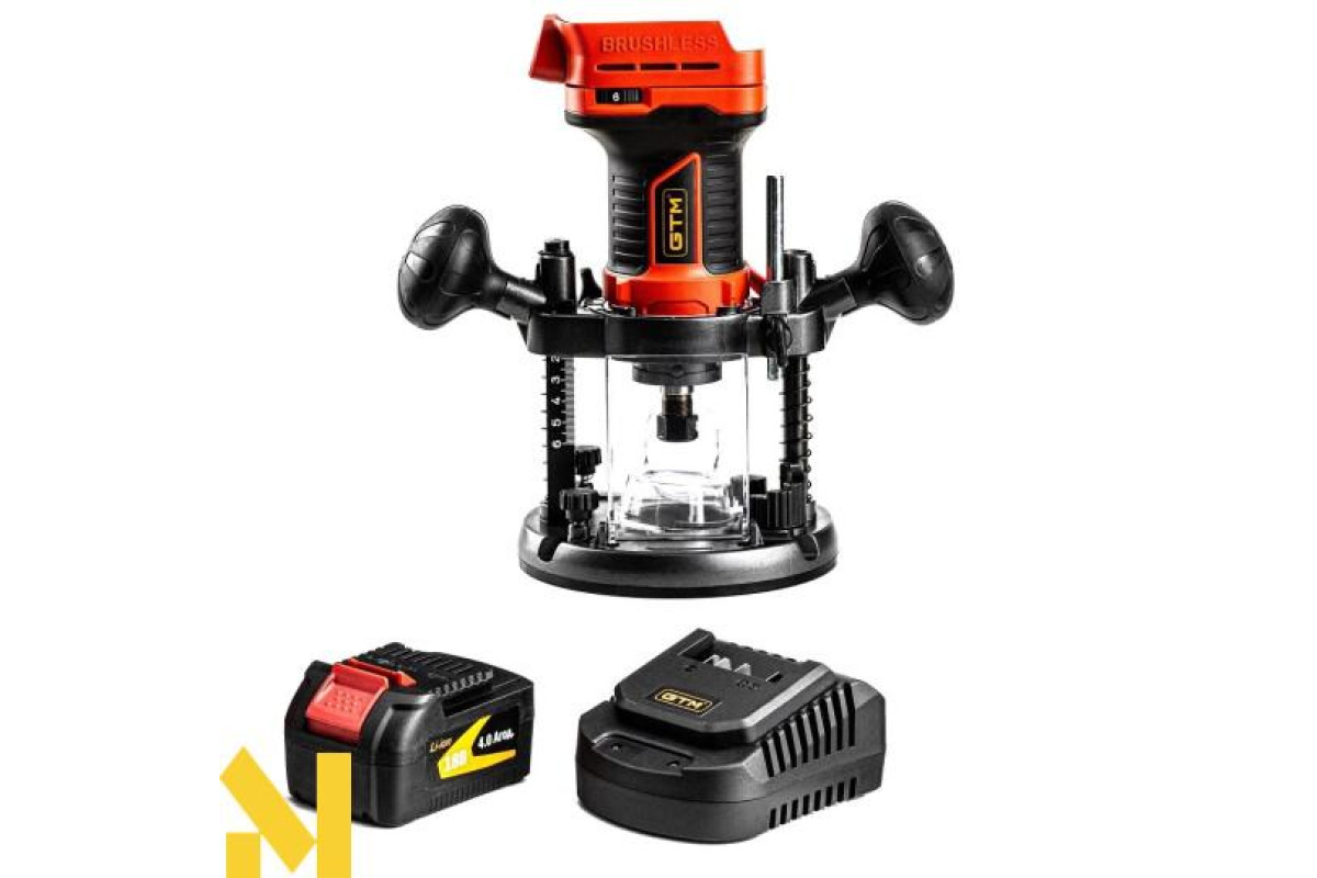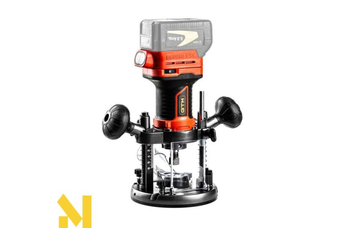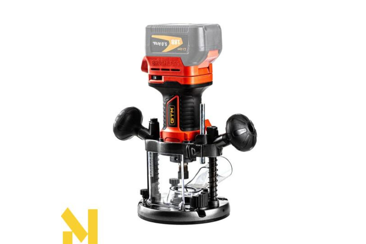 GTM R18/55BL - потужний інструмент при виконанні численних робіт з обробки дерева, з живленням від стандартних акумуляторів GTM 18V. Конструкція даної моделі дозволяє використовувати його як вертикальний, так і кромочний тип фрезера. У фрезер вбудований продуктивний безщітковий двигун, який набагато ефективніше витрачає заряд акумулятора. Регульована цанга дає можливість застосовувати фрези з хвостовиком 6 мм і 8 мм.