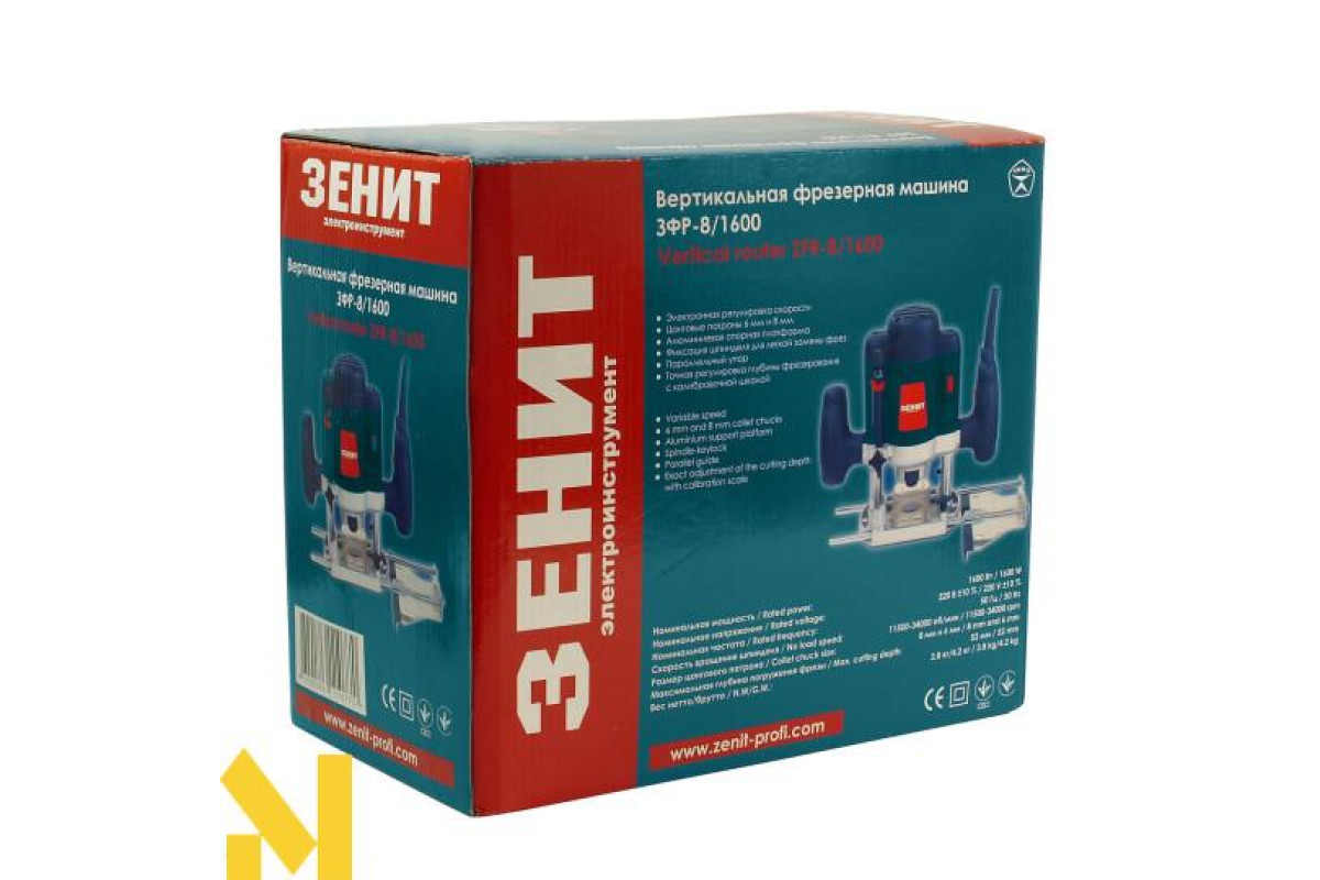 Номінальна потужність, Вт 1600 Номінальна частота, Гц: 50 Номінальна напруга, В: 220 + _10% Швидкість обертання шпинделя, об / хв: 11500-34000 Розмір цангового патрона, мм: 6 і 8 Вага нетто / брутто, кг: 3,8 / 4,2ОСОБЛИВОСТІ: Електронне регулювання швидкість; Цангові патрони 6 мм і 8 мм; Алюмінієва опорна платформа; Фіксація шпинделя для легкої заміни фрез; Паралельний упор; Точне регулювання глибини фрезерування з калібрувальної шкалою. ОПИС: Вертикально-фрезерна машина Зеніт ЗФР-8/1600 - практична модель з невеликою вагою, зручна для ручної обробки дерева, має міцну і надійну конструкцію з добре продуманими деталями, виконану в ергономічній формі, за рахунок чого полегшується процес роботи з інструментом і підвищується комфорт користувача . КОМПЛЕКТАЦІЯ: Патрубок для пилесосоа; 2 гвинта, 2 гайки; Штовхав дерев'яний з фрезами 12шт .; Ключ шестигранний; Ключ для цанги; Гвинт з баранчиком; Упор з штангами; щітки; Доп фрези 2шт.- ВиробникЗеніт