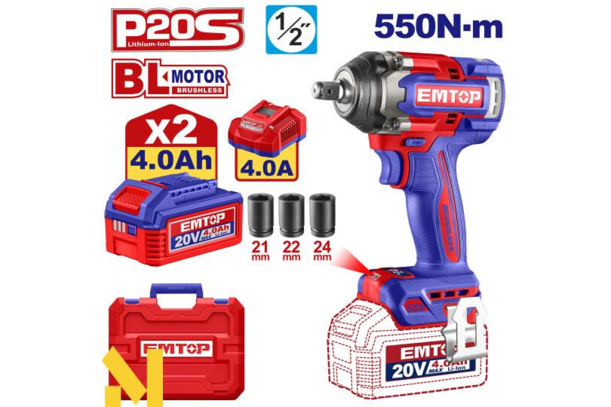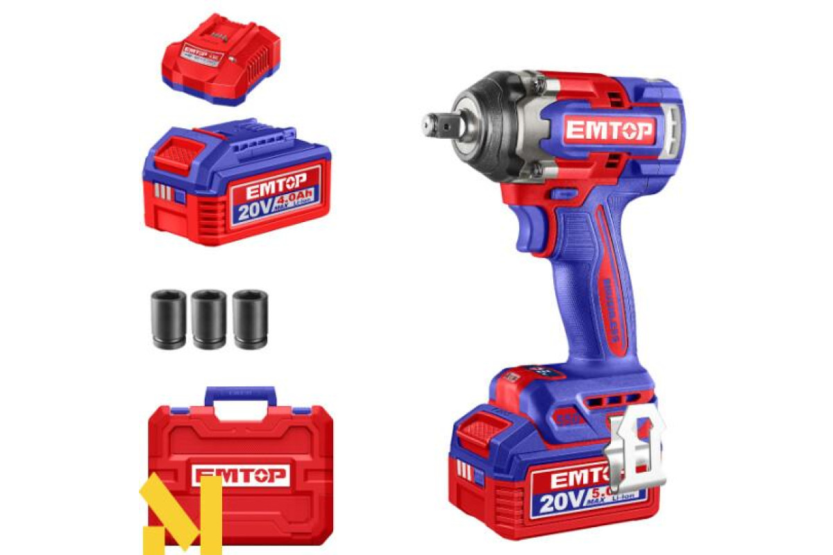 Акумуляторний ударний гайковерт Emtop ECIWL2055 — зручний та мобільний інструмент для щоденної роботи, що постачається у практичному комплекті для одразу готової роботи.