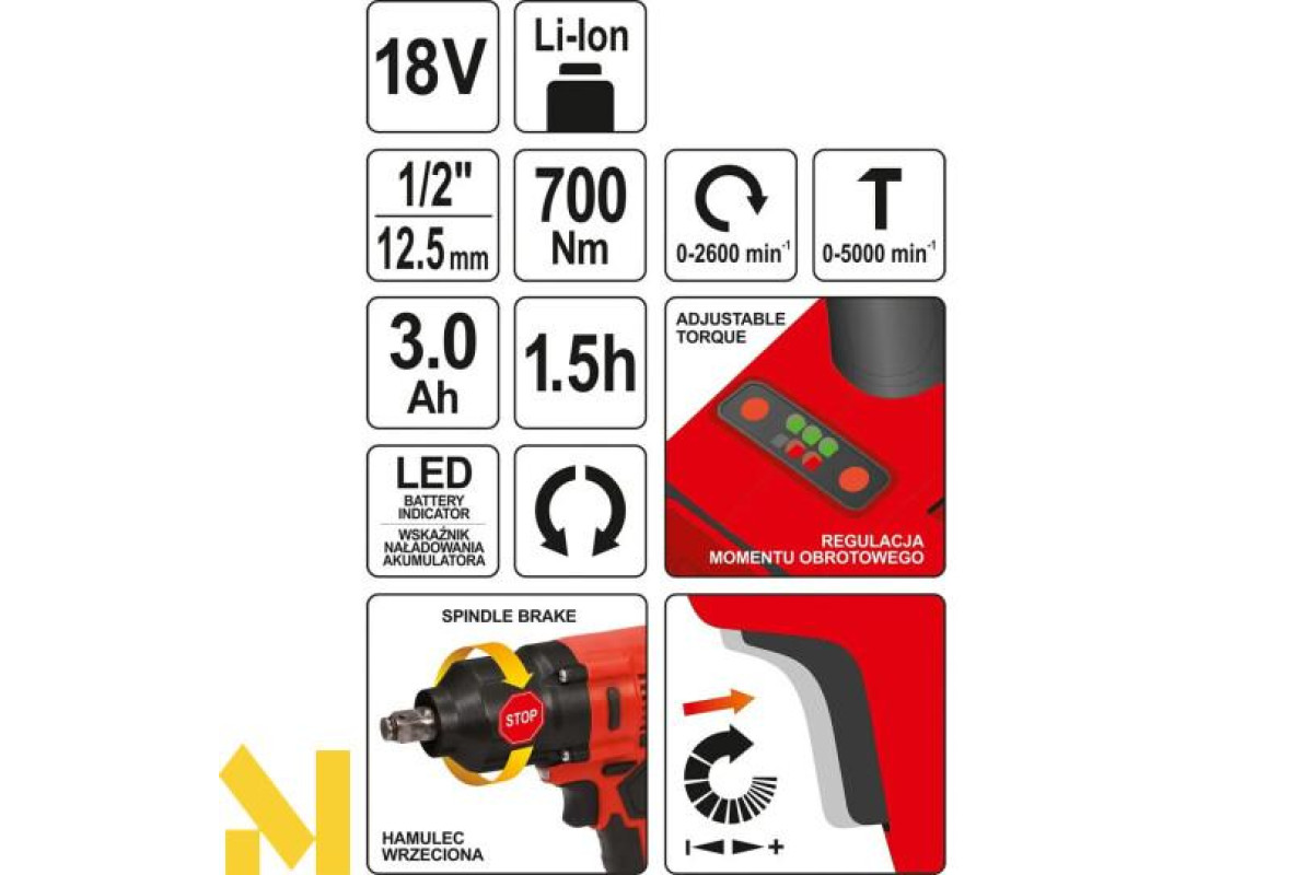 Крутний момент до 700 Нм з триступеневим регулюванням (400, 550 і 700 Нм) і світлодіодним індикатором.
