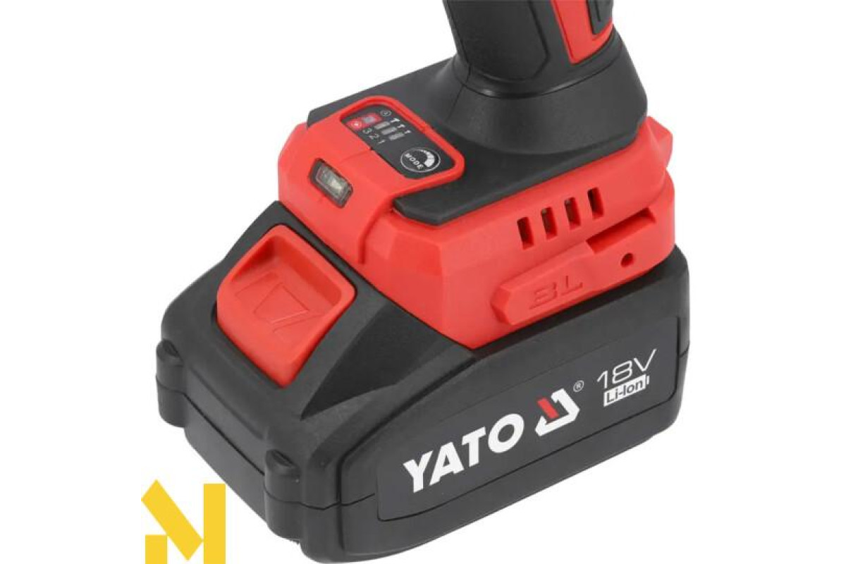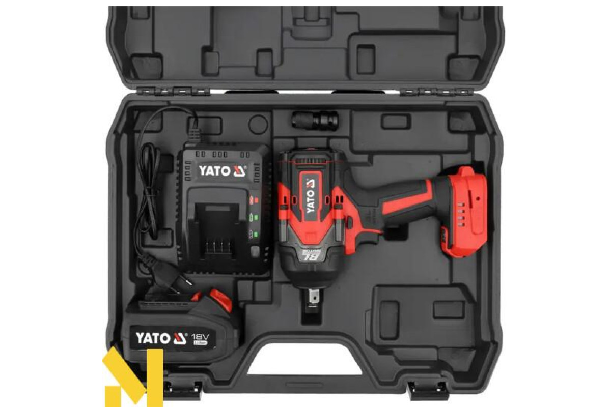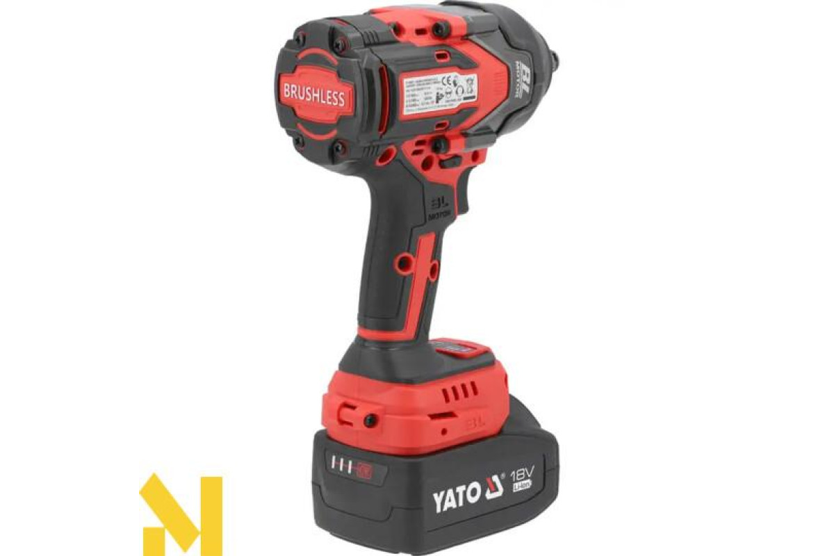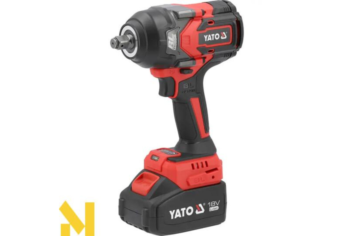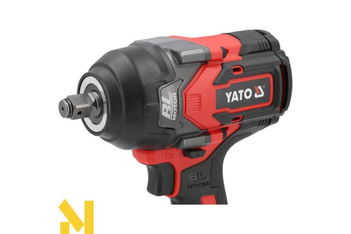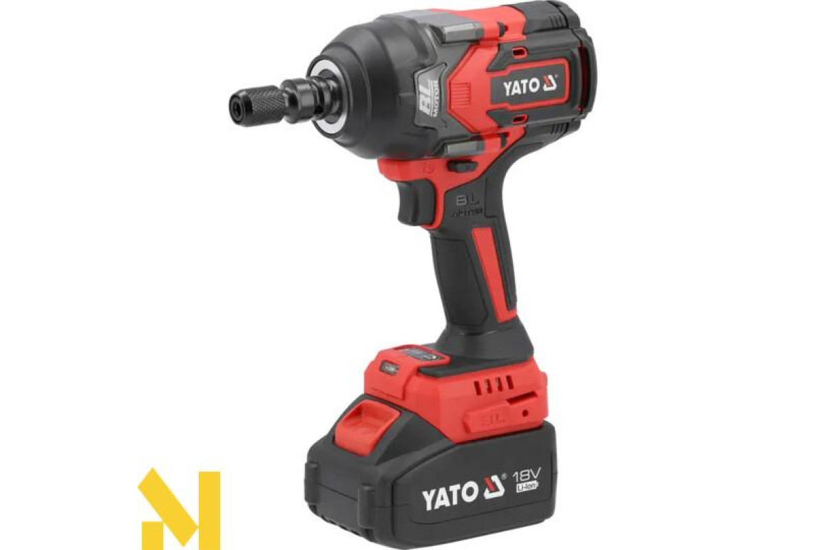 Безщітковий ударний гайковерт із живленням від платформного акумулятора YATO 18 В. Завдяки компактним розмірам і крутному моменту 1200 Нм його можна використовувати як в автосервісах, так і на будівельних майданчиках. Невелика вага дає змогу комфортно працювати з піднятим над головою ключем. Інструмент поставляється з адаптером від 1/2 до 1/4 дюйма.