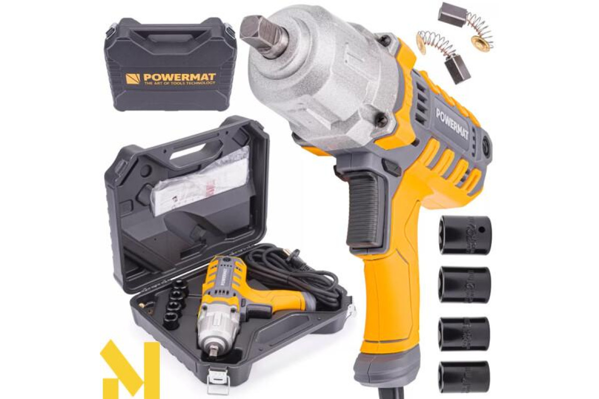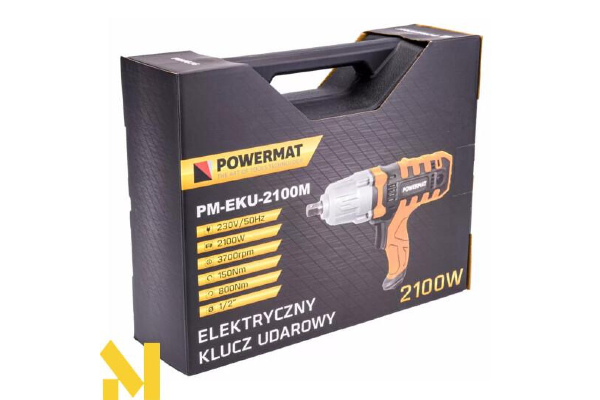 Електричний гайковерт Powermat PM-EKU-2100M - це нове покоління гайковертів з цікавим дизайном і крутним моментом 720 Нм. Міцний корпус ударного механізму забезпечує тривалу безперебійну роботу. Кулісний перемикач "за годинниковою стрілкою/проти годинникової стрілки" розташований безпосередньо над кінчиками пальців, що дозволяє перемикати без використання другої руки. Така система зміни напрямку успішно використовується в акумуляторних викрутках. Тримач інструменту - 1/2-дюймовий квадрат. Ззовні викрутка має змінні щітки. Рукоятка і частина корпусу з нековзним гумовим покриттям. Вигідне положення центру ваги завдяки розташуванню рукоятки посередині інструменту забезпечує більш надійний хват і не втомлює зап'ястя. Гайковерт поставляється в практичному кейсі для перенесення.
