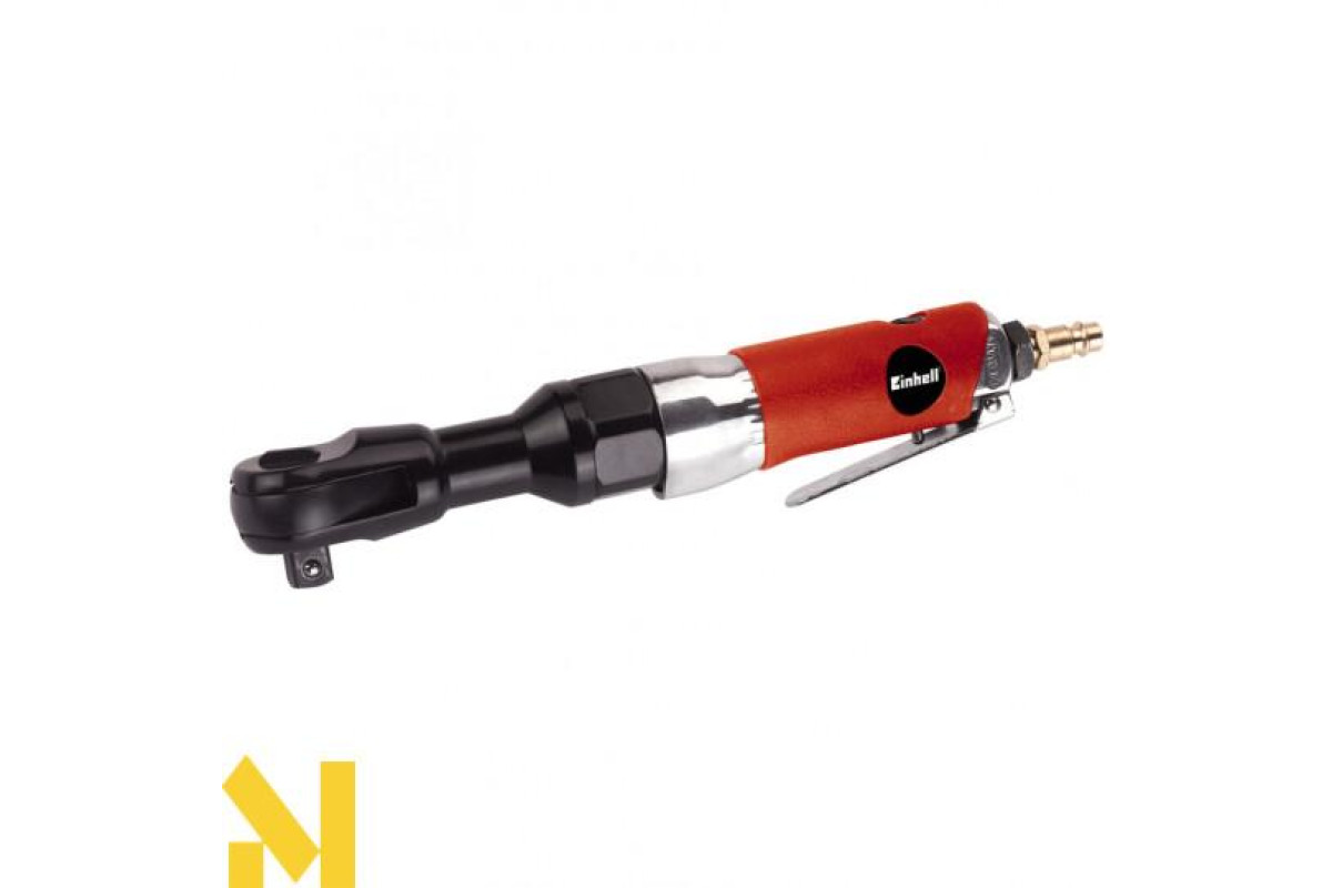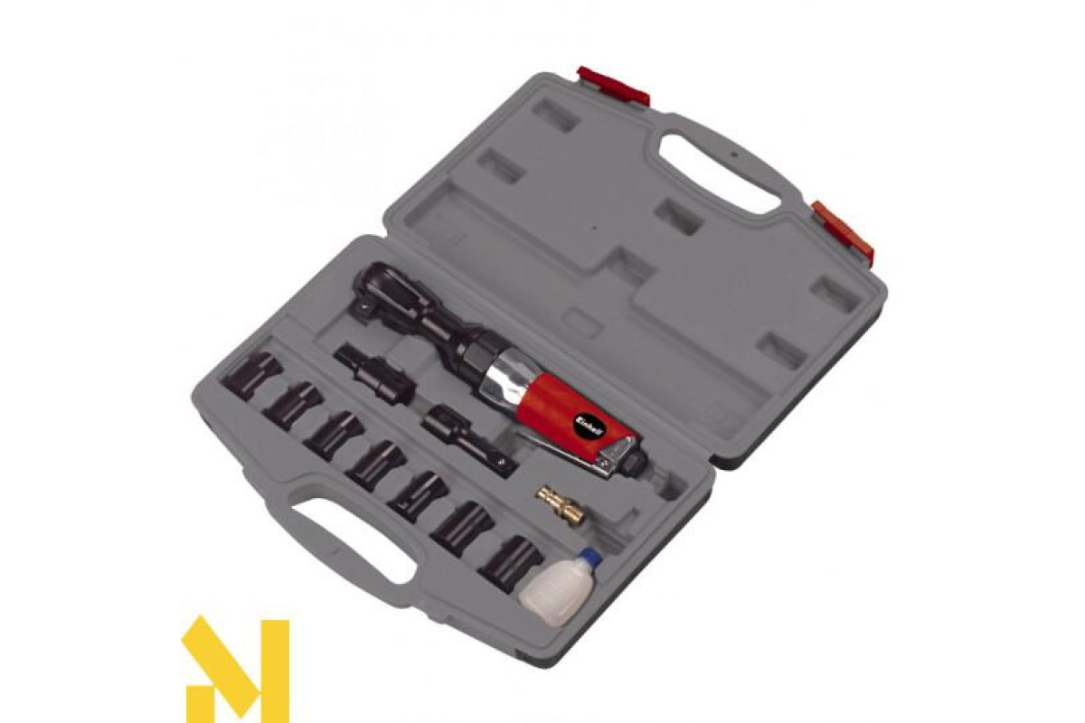 Кутовий гайковерт пневматичний Einhell DRS 200/2 з набором головок 12,7 мм (1/2 ") зручний і потужний інструмент для професійної роботи. Гайковерт оснащений простим механізмом зміни обертання храповой головки. Робочий тиск гайковерта становить близько 6 атм, при цьому максимальне зусилля становить 61 Нм. У комплект поставки входить набір торцевих ключів і зручний кейс для зберігання і транспортування. Вібропоглинаюча ручка не ковзає і має ергономічну форму для безпечної і комфортної роботи.