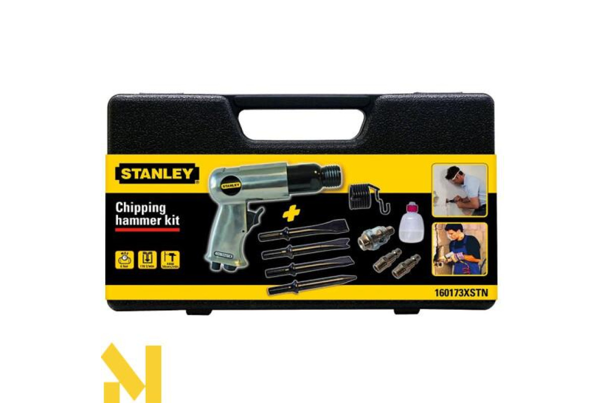 Група FINI-NUAIR з Італії є одним з найбільших виробників компресорів у світі. Компанія розширила своє виробництво нової лінійки компресорів марки Stanley - безумовний лідер у галузі з 1843 року. Нові моделі були розроблені для професійного використання і для аматорів. Компресори Stanley є інноваційним технічним рішенням, до деталей і повної надійності. Пневматичний гайковерт в наборі. Включає в себе: масло, 4 зубила, 2 швидкорознімних з'єднання, маслорозпилювач, пружина, пластикова валіза. Витрата повітря 170 літрів, робочий тиск 6 бар, вага 1,6 кг. Комплектація: