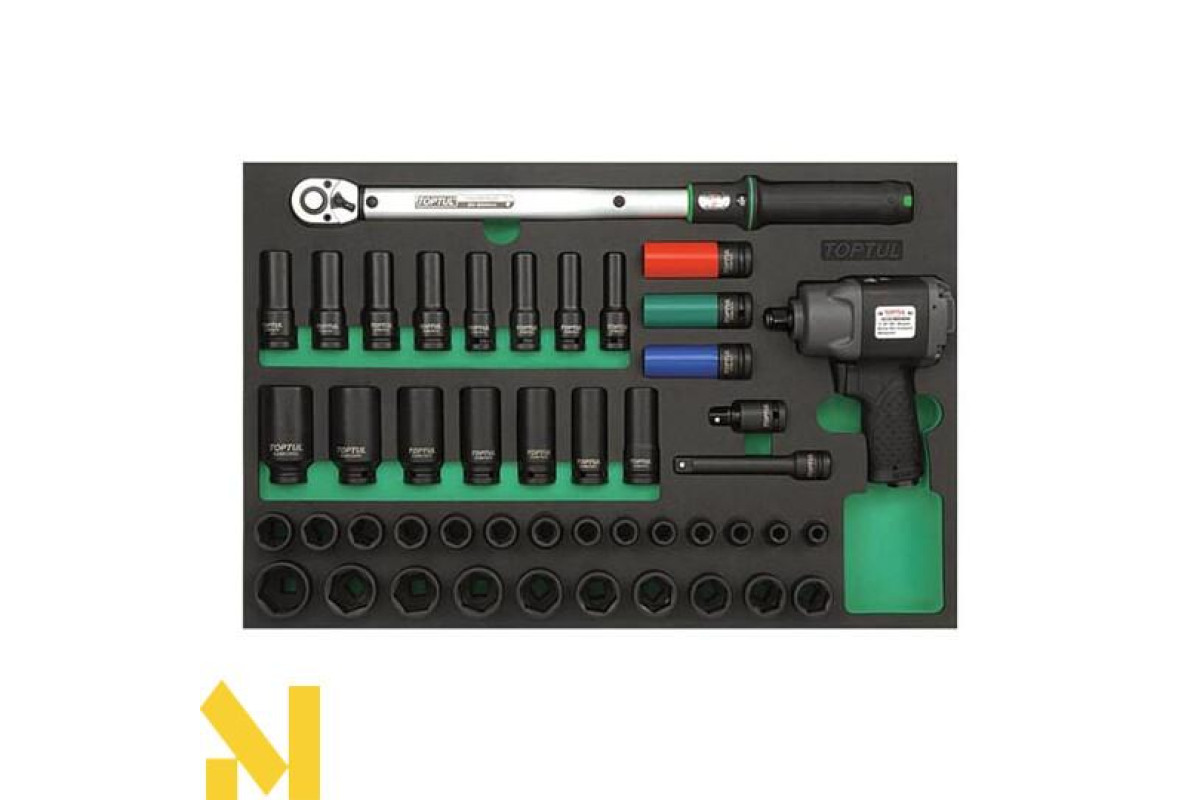 Набір ударного інструменту GVD4602 від торгової марки Toptul включає в себе набір головок ударних коротких від 8 до 32 мм і довгих від 10 до 32 мм, три головки шиномонтажних з пластиковим покриттям для захисту дисків від подряпин, кардан і подовжувач 125 мм. Комплект так само містить пневмогайковерт 1/2" з обертовим моментом 610 Нм 9600 об/хв, динамометричний ключ 1/2" з довжиною 500 мм і зусиллям 20-200 Нм. Для виробництва головок використовується міцний хром молібденовий сплав сталі, який є більш пружним і відповідним для використання спільно з ударним інструментом. Пневмогайковерти і динамометричні ключі виготовлені у відповідності з усіма міжнародними стандартами якості DIN та ISO.