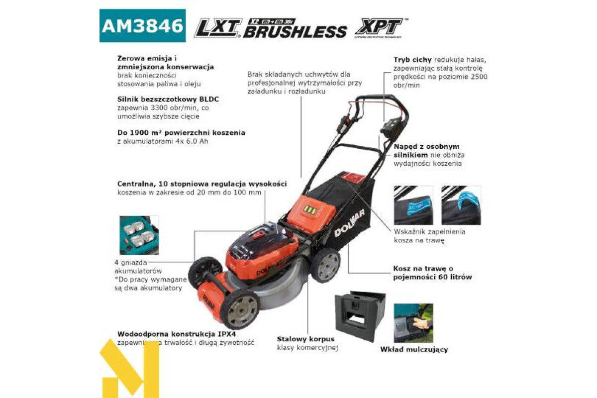 Makita DEBAM3846Z (DOLMAR AM3846Z) – акумуляторна газонокосарка з шириною зрізу 46 см, з травозбірником об’ємом 60 л, призначена для газонів площею приблизно 1800 м2, має 10 рівнів висоти зрізу від 20 до 100 мм. Косарка дозволяє косити траву кошиком, косити траву без кошика, збирати траву і мульчувати. Режим тихої роботи 2500 об/хв для роботи в надзвичайно чутливих до шуму зонах, режим високої продуктивності з автоматичним регулюванням швидкості та крутного моменту - ADT, функція плавного пуску поступово збільшує швидкість, щоб усунути стартовий удар. Регулювання постійної швидкості підтримує постійну швидкість під навантаженням. Оснащений безщітковим двигуном постійного струму BLDC, додатково технологією XPT з підвищеною стійкістю до пилу та вологи. Міцний сталевий корпус. Косарка живиться від 2 акумуляторів системи LXT 18 В. Екологічно чистий з нульовими викидами та дуже низьким рівнем шуму.