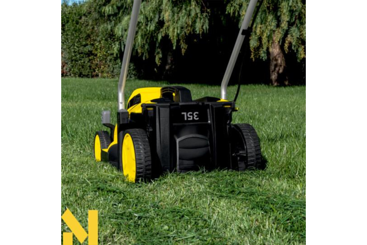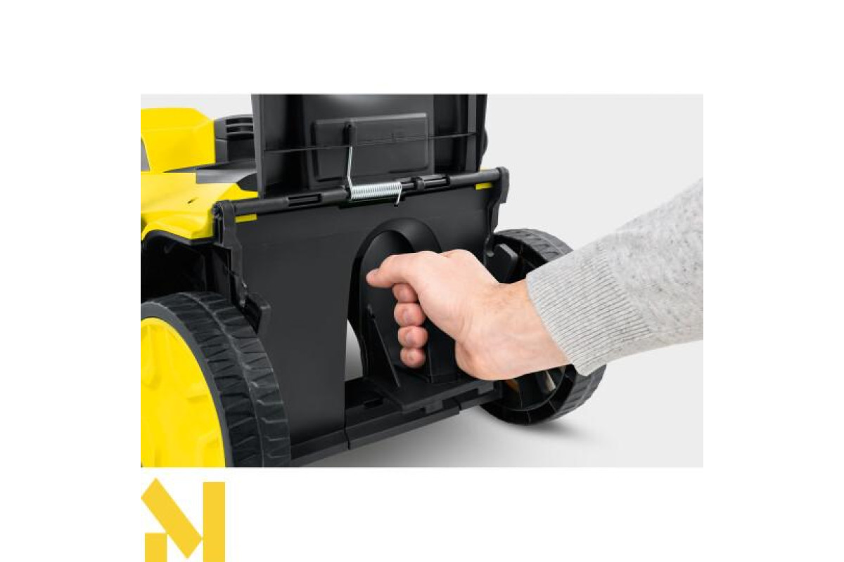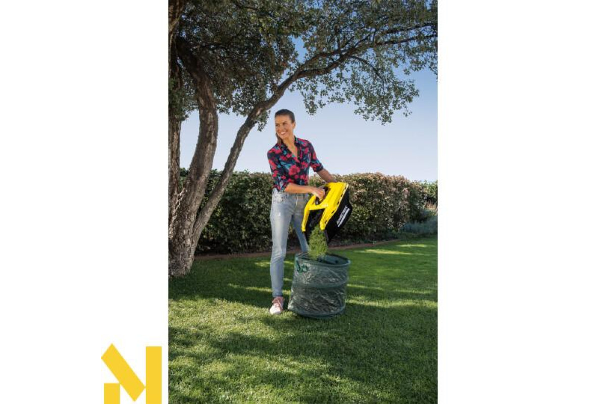 - Складна напрямна ручка дозволяє економити місце при зберіганні. Текстильна сумка для збору може бути складена дуже компактно і займає мало місця при укладанні на газонокосарку.