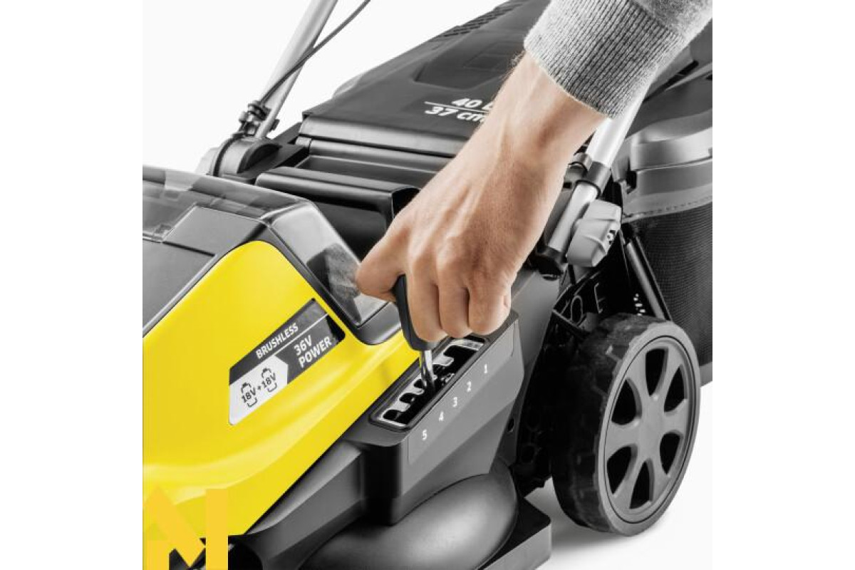 Працює від двох акумуляторів 18 В для потужного двигуна 36 В у поєднанні з шириною стрижки 37 см – ідеально підходить для газонів площею до 450 м².