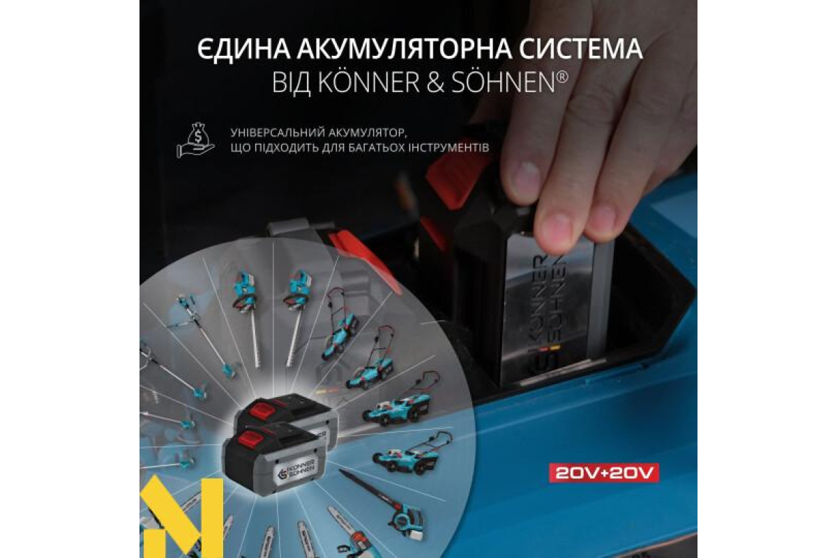 Єдина акумуляторна система дозволяє використовувати одну батарею для всієї лінійки акумуляторної садової техніки Könner & Söhnen без додаткових адаптерів чи перехідників.