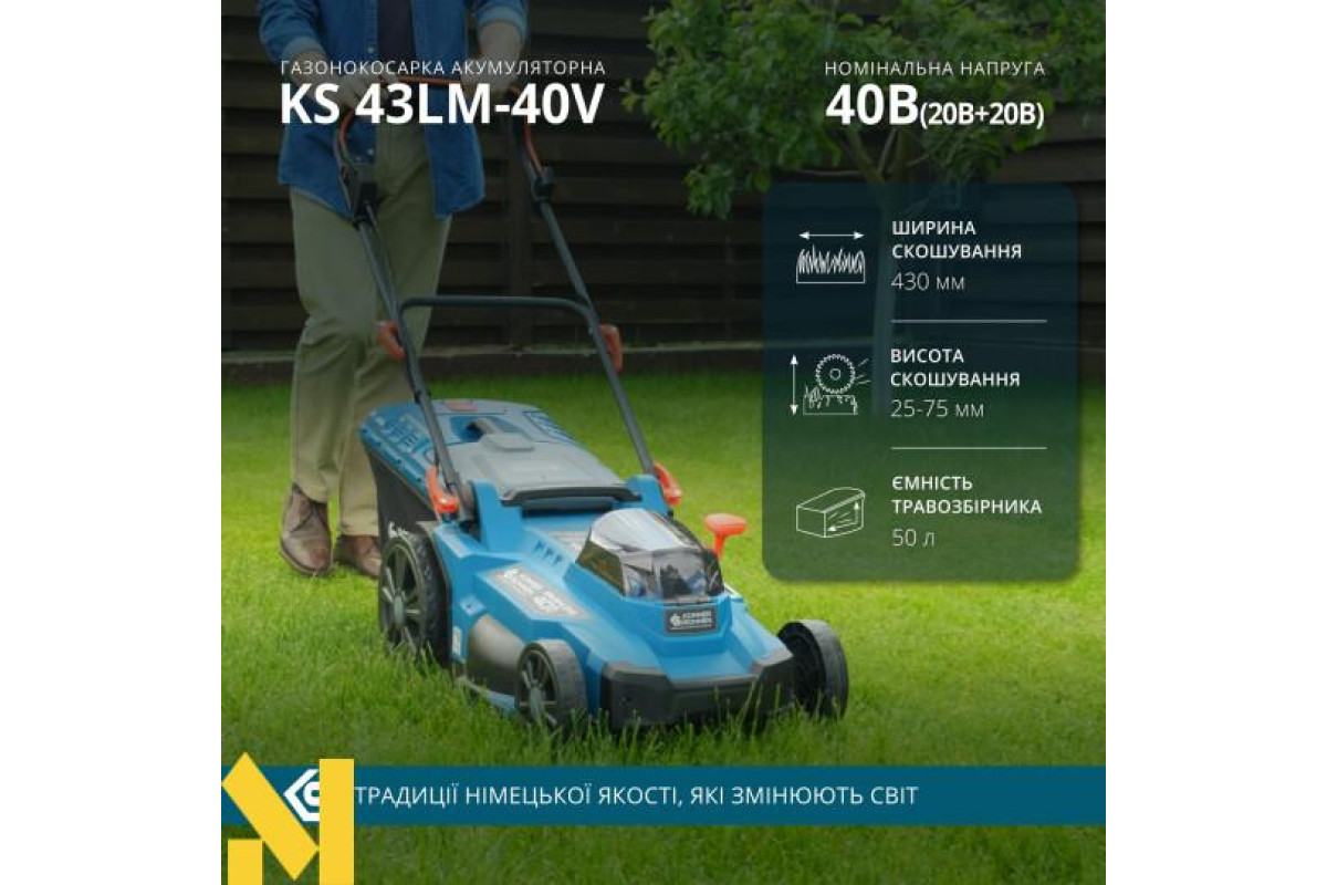 Акумуляторна газонокосарка KS 43LM-40V – це автономний інструмент для догляду за газоном, який забезпечує рівномірний і доглянутий газон.