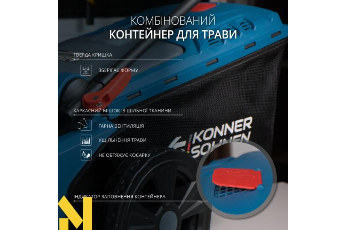 Травозбірник косарки виготовлений комбінованим способом - має пластикову кришку та каркасний мішок із щільної тканини, він не обтяжує косарку, зберігає форму та має гарну вентиляцію. Ємність контейнеру на 50 л дозволяє збирати достатній об’єм скошеної трави. Кошик для трави оснащений індикатором заповнення контейнера.