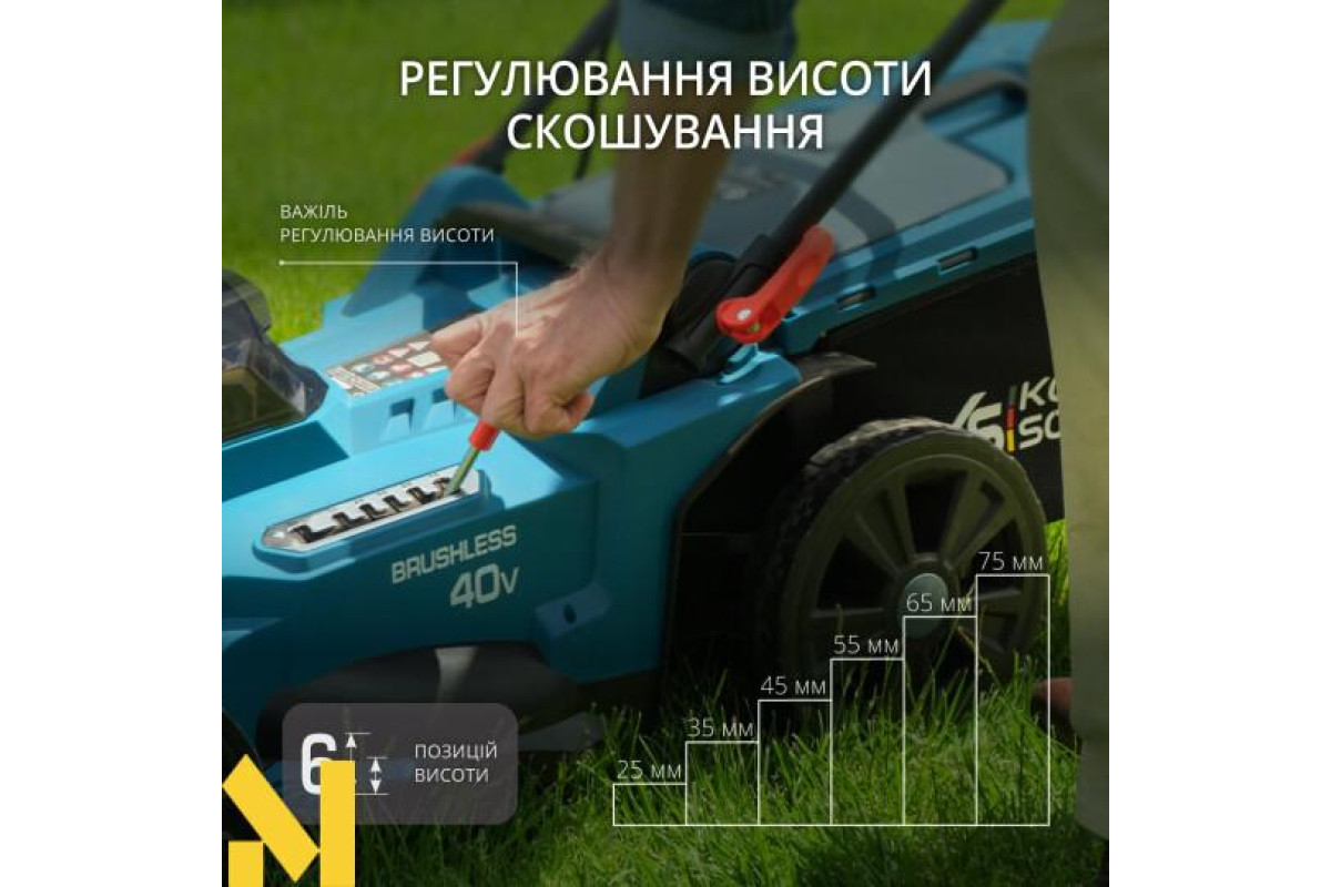 Зручний важіль регулювання рівня скосу має 6 позицій, діапазон висоти зрізу від 25 мм до 75 мм, що надає можливість налаштовувати газонокосарку під індивідуальні потреби та дозволяє досягати оптимальної висоти газону.