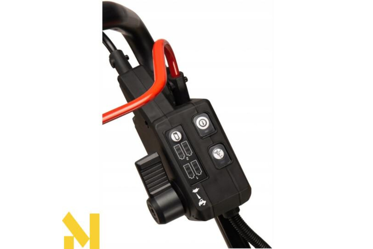 - Посилена рукоятка з легким доступом до панелі управління з головним вимикачем, перемикачем режиму з низьким рівнем шуму і індикатором заряду акумулятора
