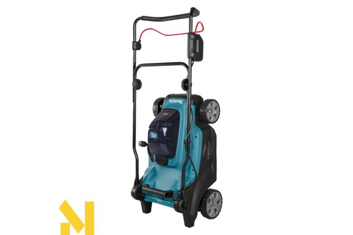 Натискна планка регулюється без використання інструментів, що забезпечує зручне зберігання газонокосарки у компактному вертикальному положенні;