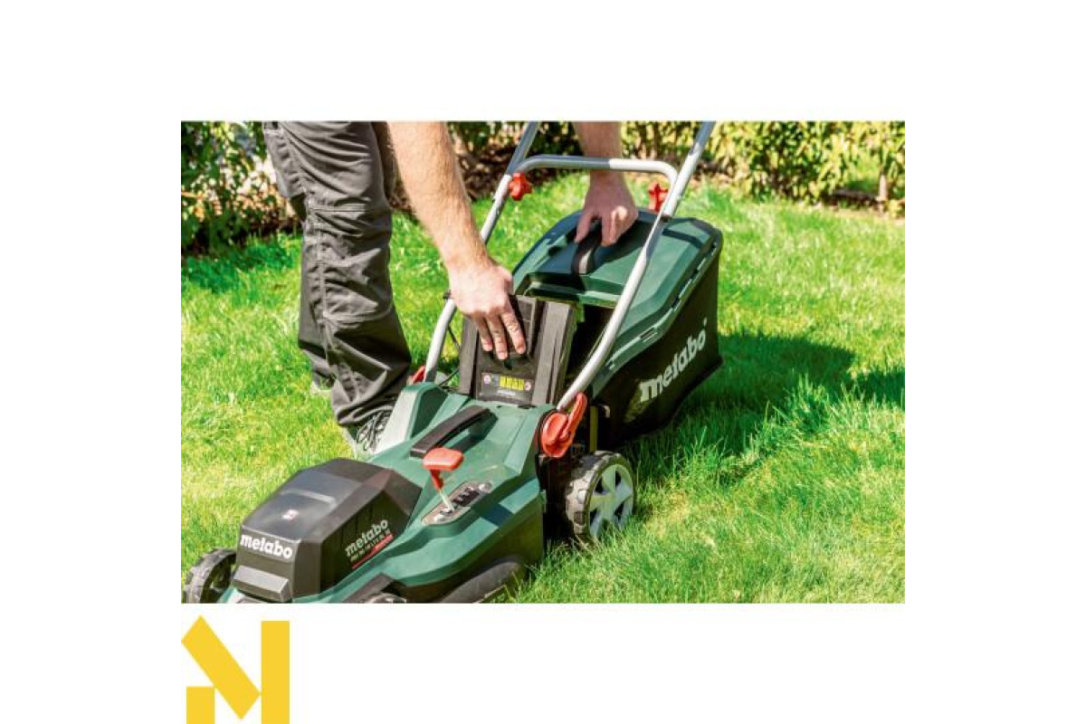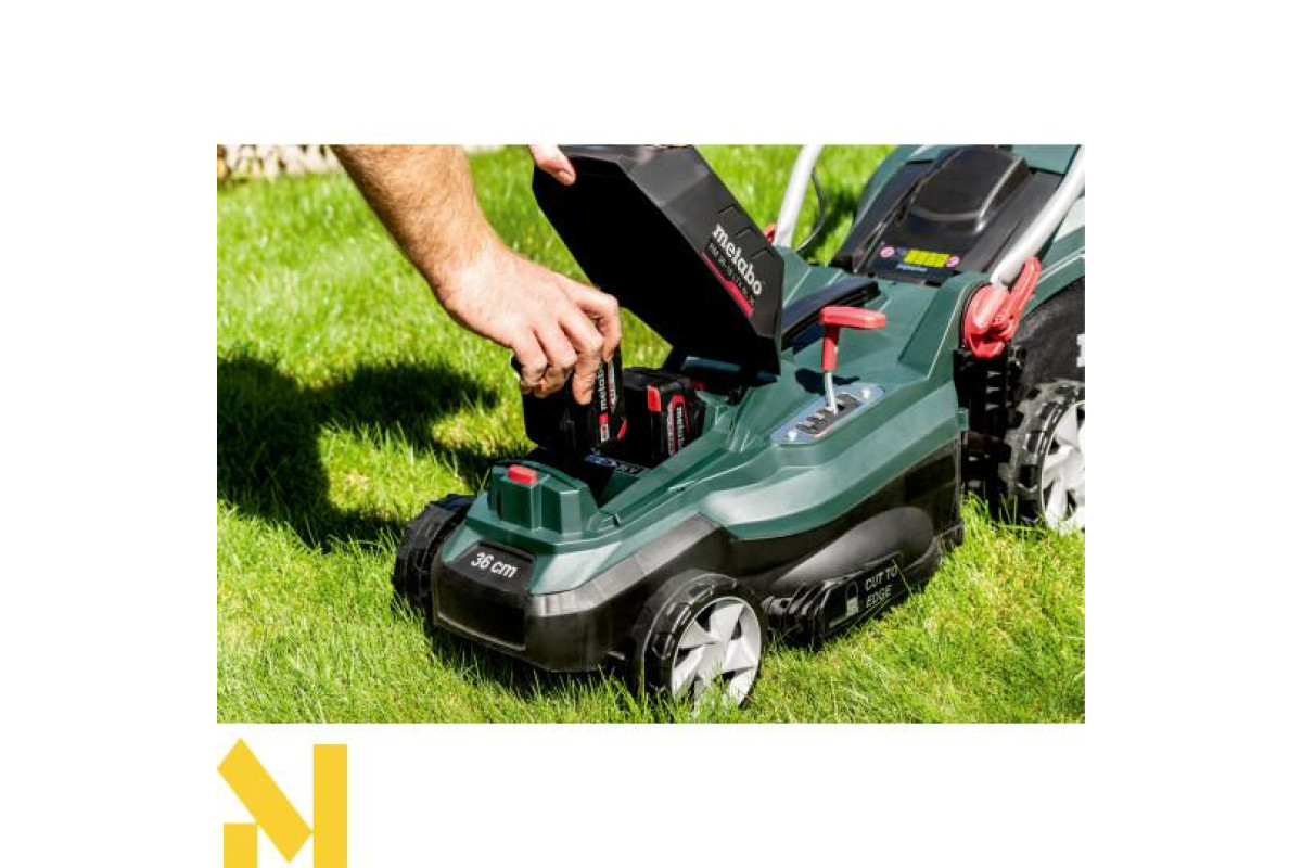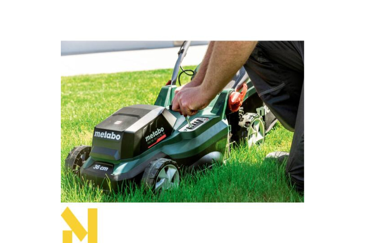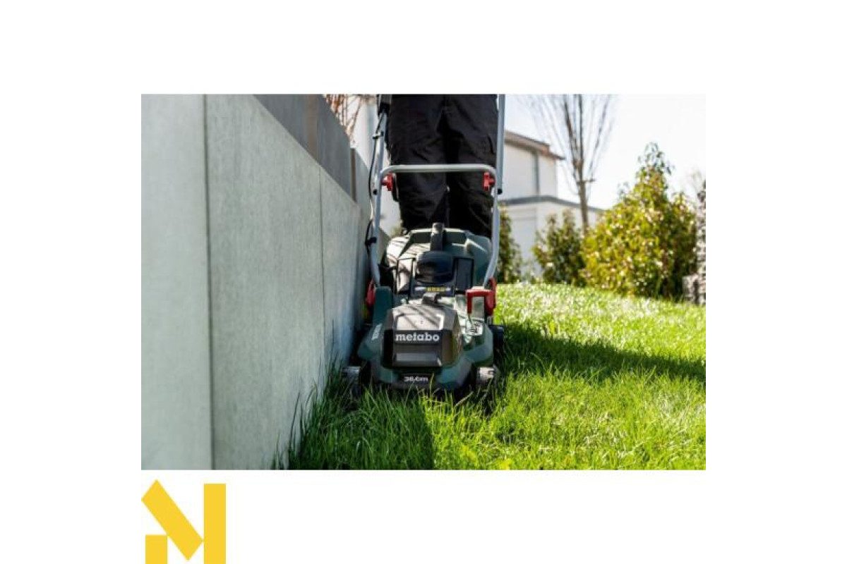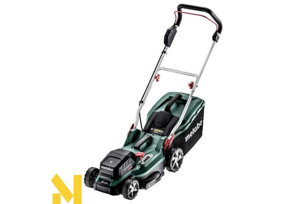 Акумуляторна газонокосарка Metabo RM 36-18 LTX BL 36 каркас чудовий вибір для скошування, мульчування та збору трави, на ділянках площею до 350 м². У цю комплектацію не входять акумуляторні блоки та зарядний пристрій.